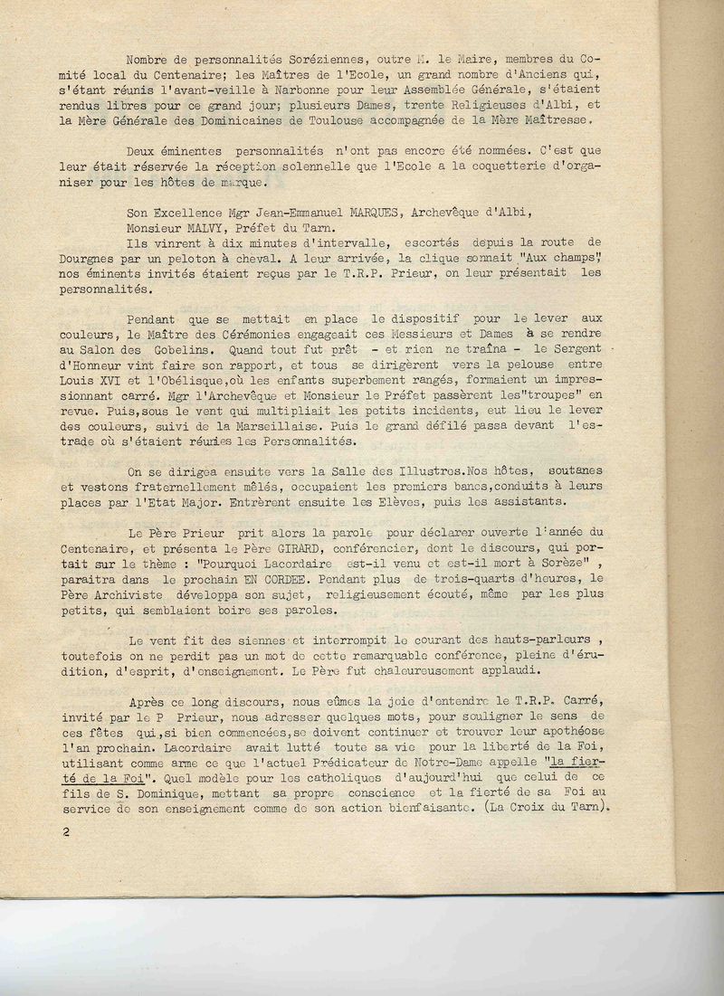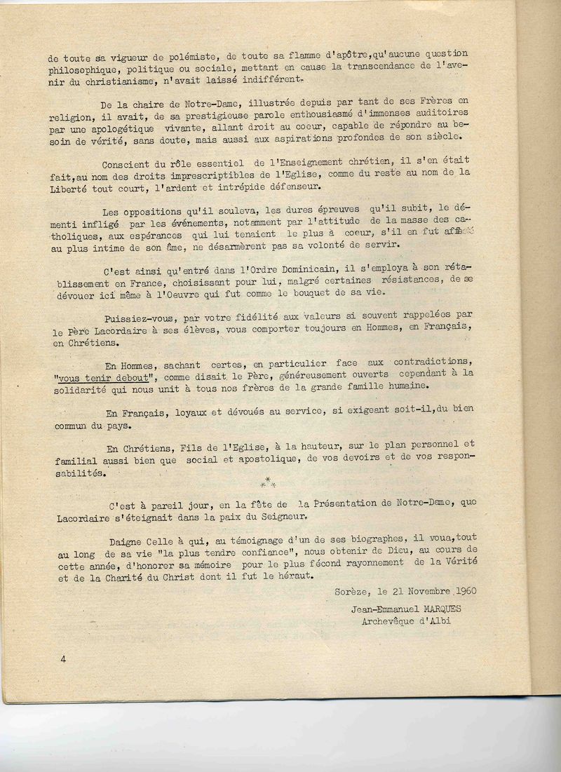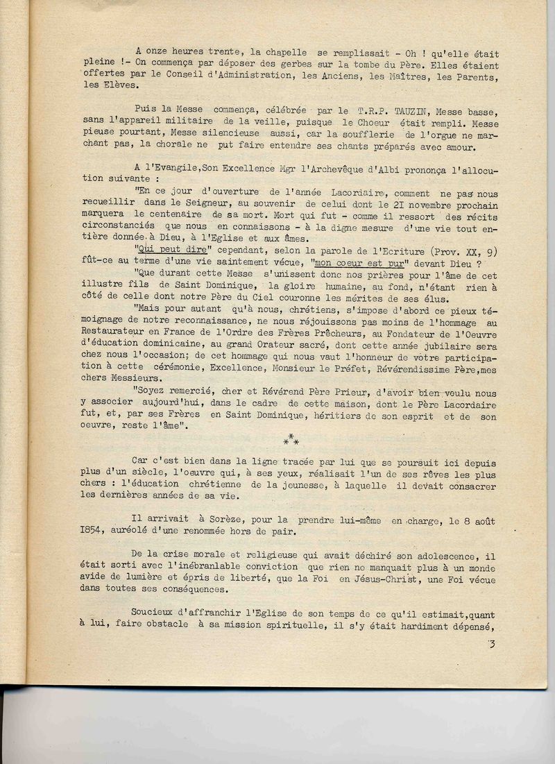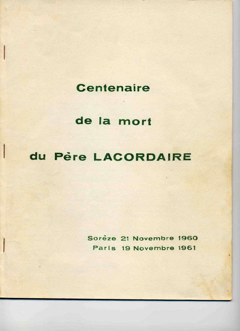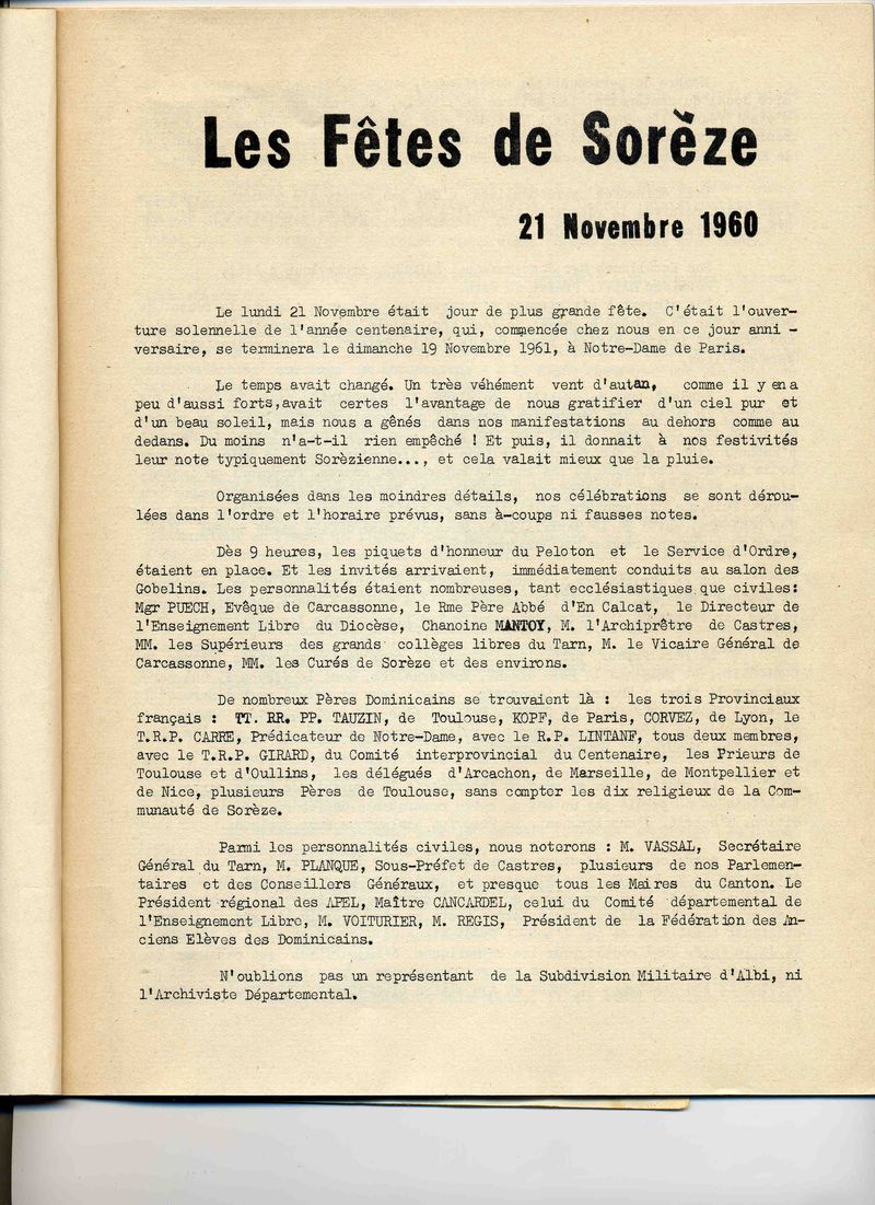 Compte-rendu de la journée du 21 novembre 1960 célébrant à Sorèze le centenaire de la mort du Père Lacordaire