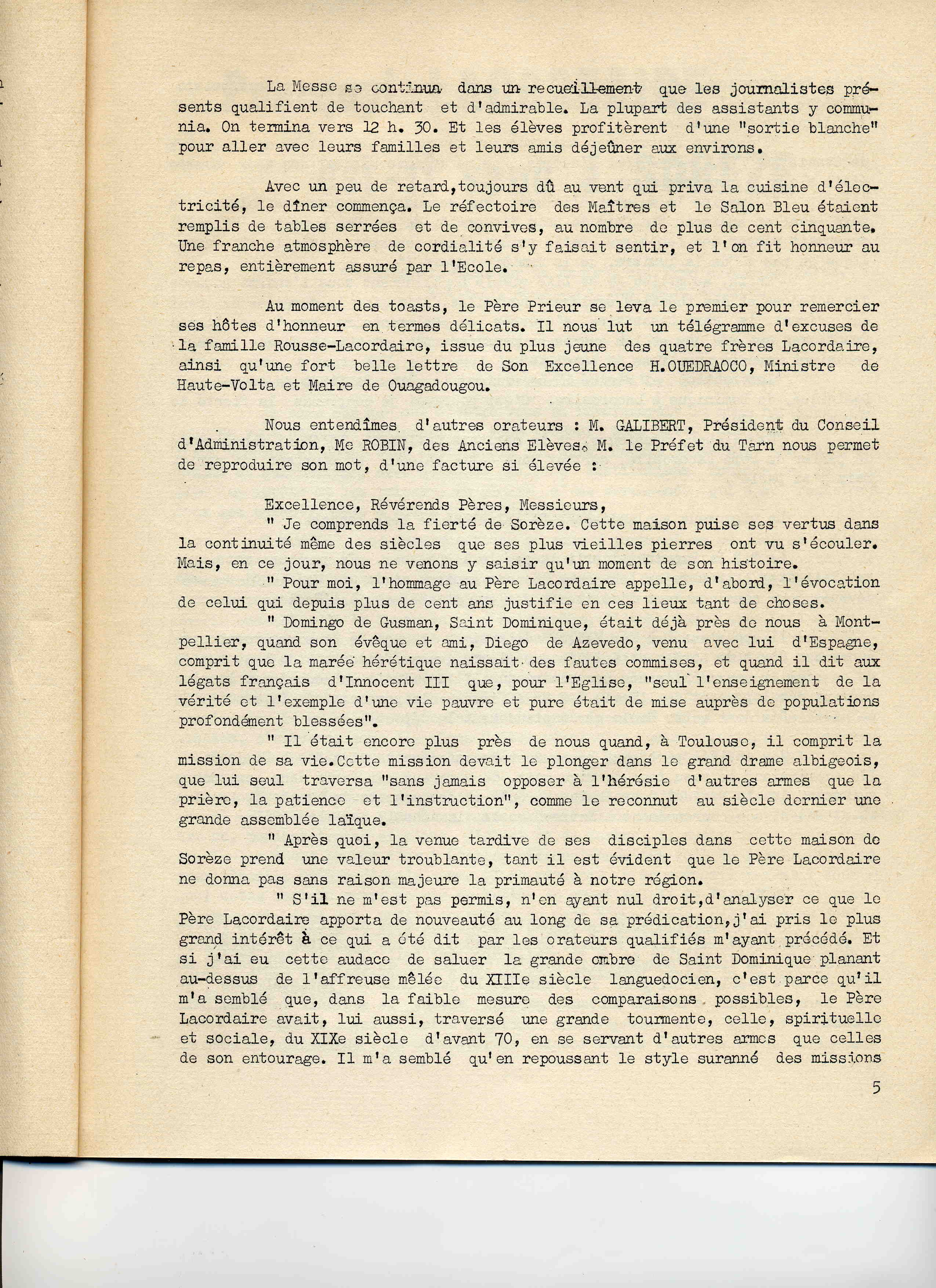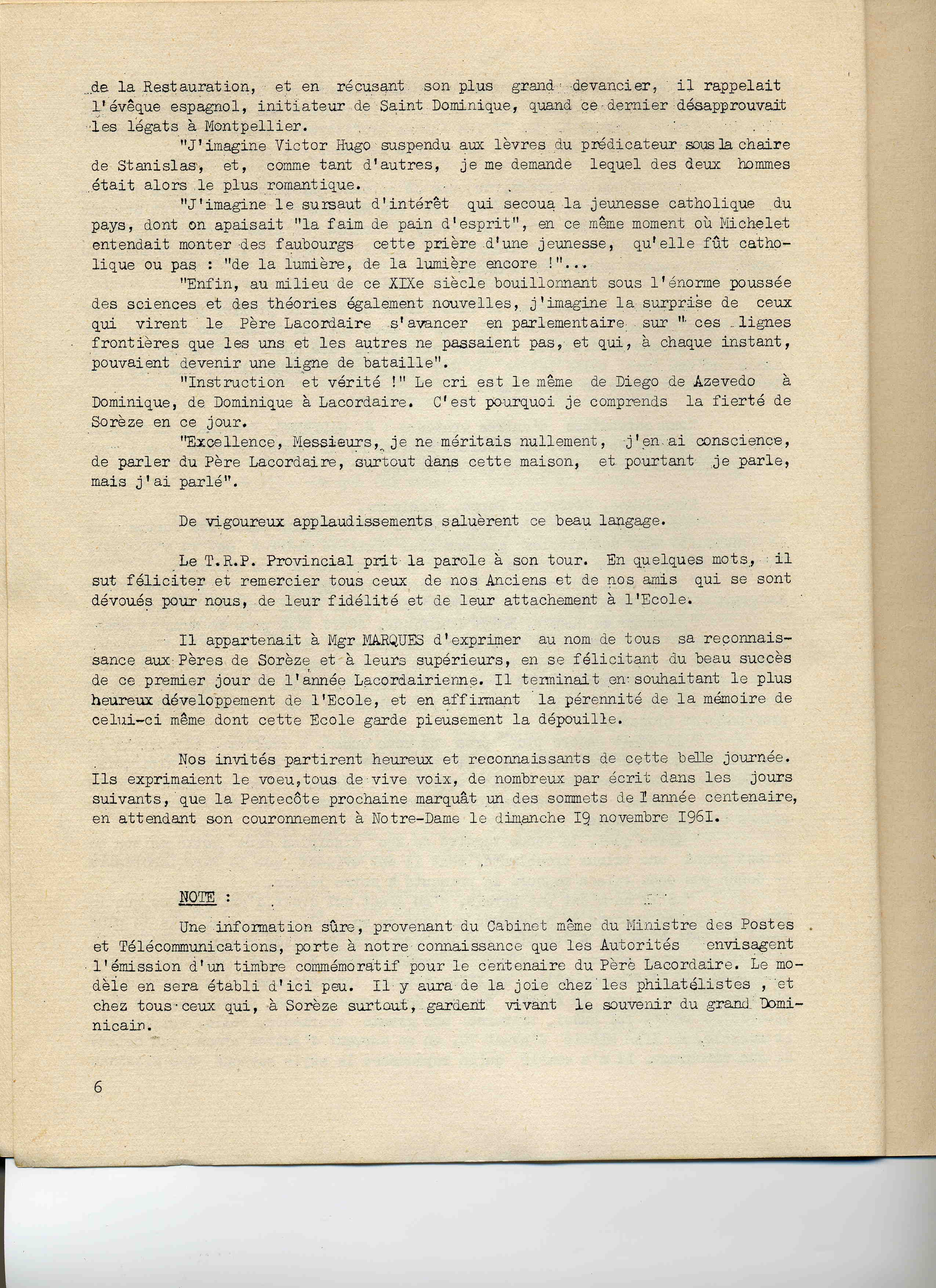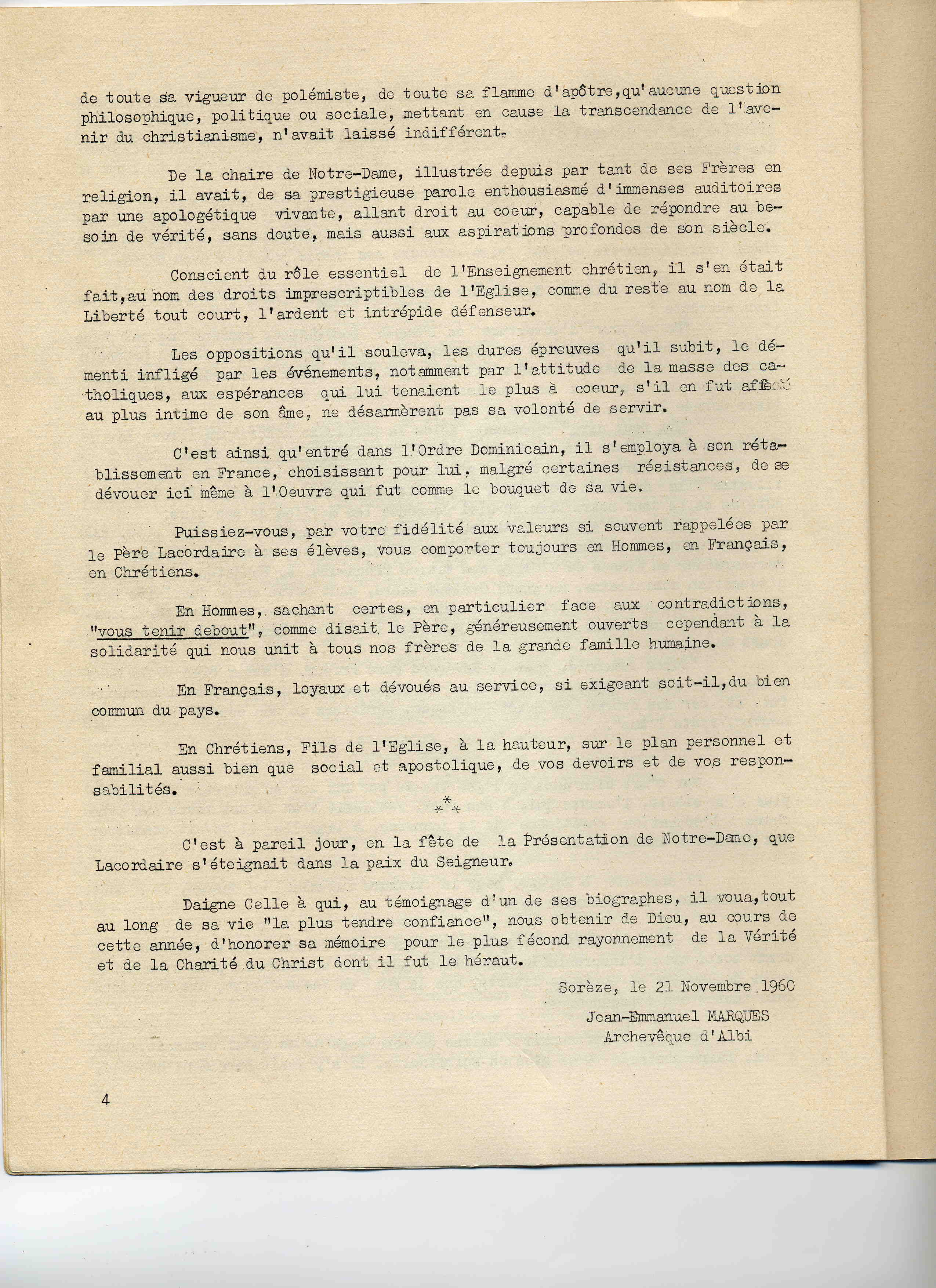 Compte-rendu de la journée du 21 novembre 1960 célébrant à Sorèze le centenaire de la mort du Père Lacordaire