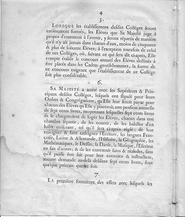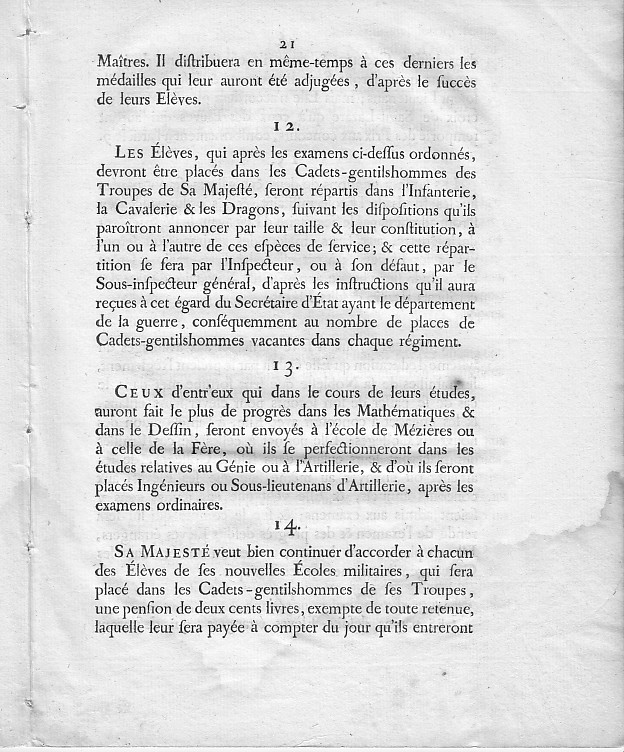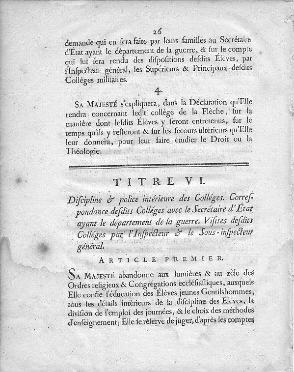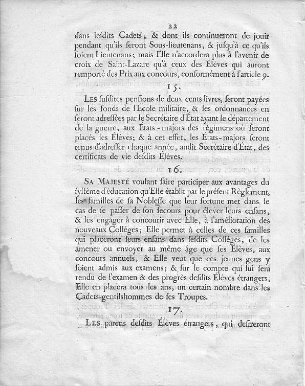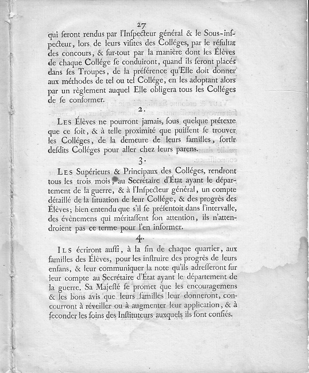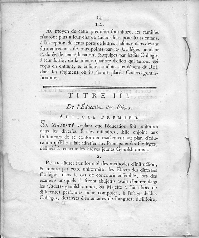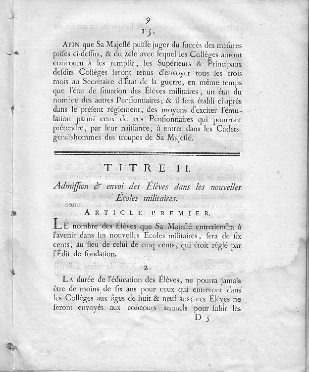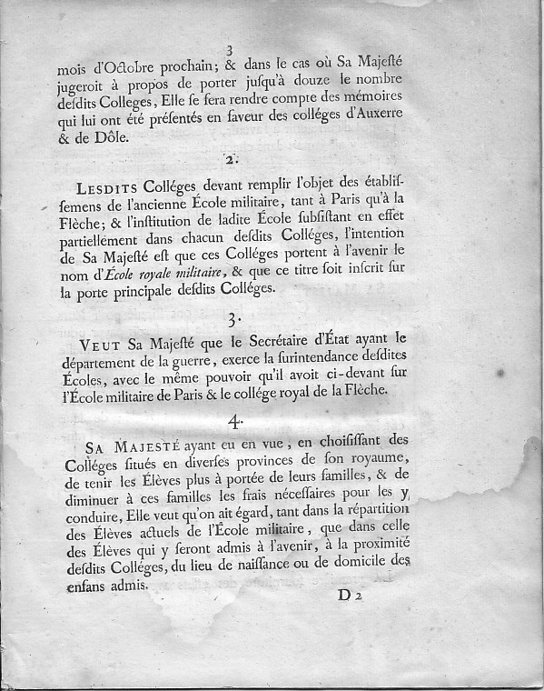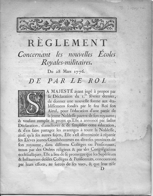 1776, Réglement concernant les nouvelles Ecoles Royales-militairesdocument original, d'époque