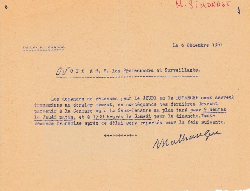 1961, 6 décembre, note du Père Malbranque aux professeurs et surveillants