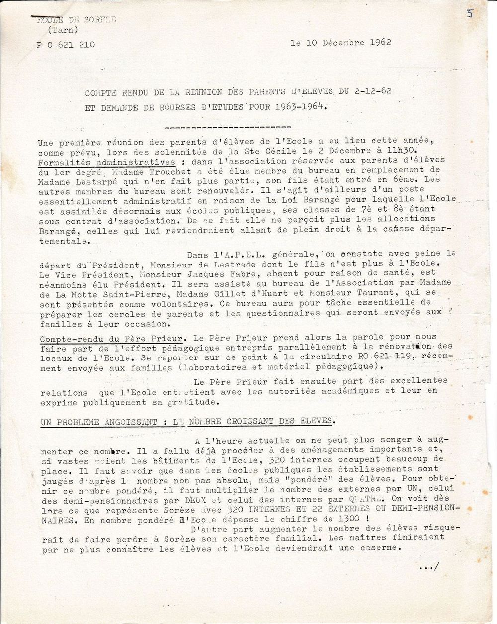 1962, 10 décembre, compte-rendu de la réunion des parents d'élèves