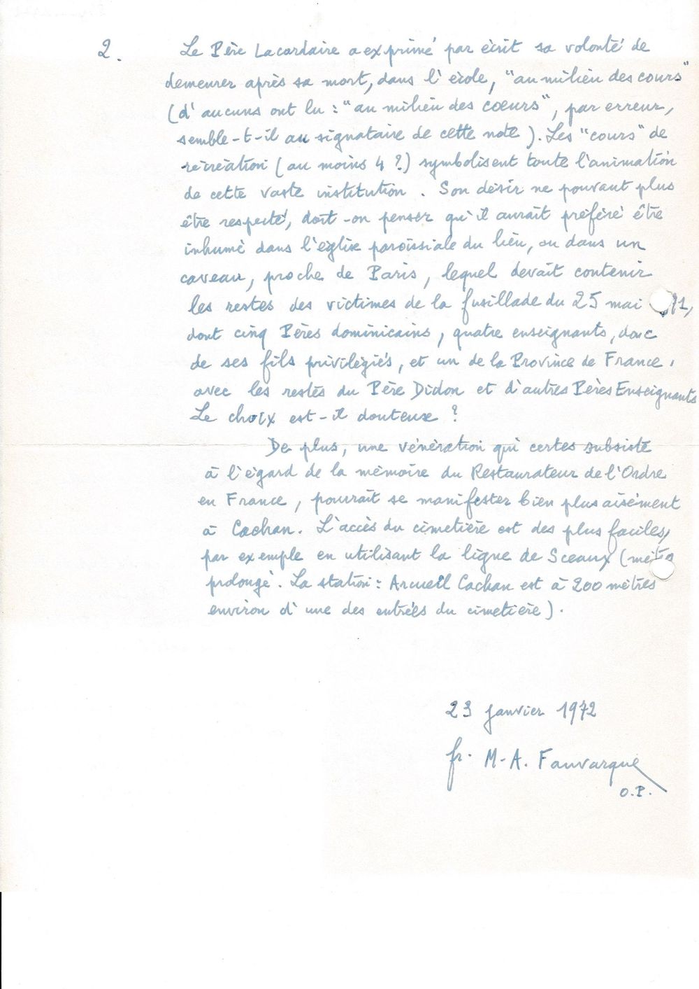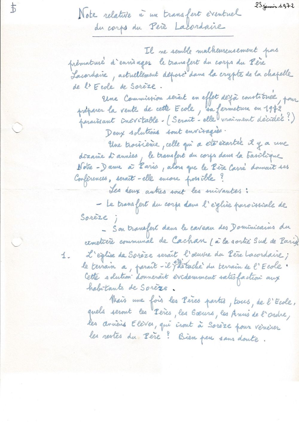 1972, 23 janvier,note relative à un transfert éventueldu corps du Père Lacordaire