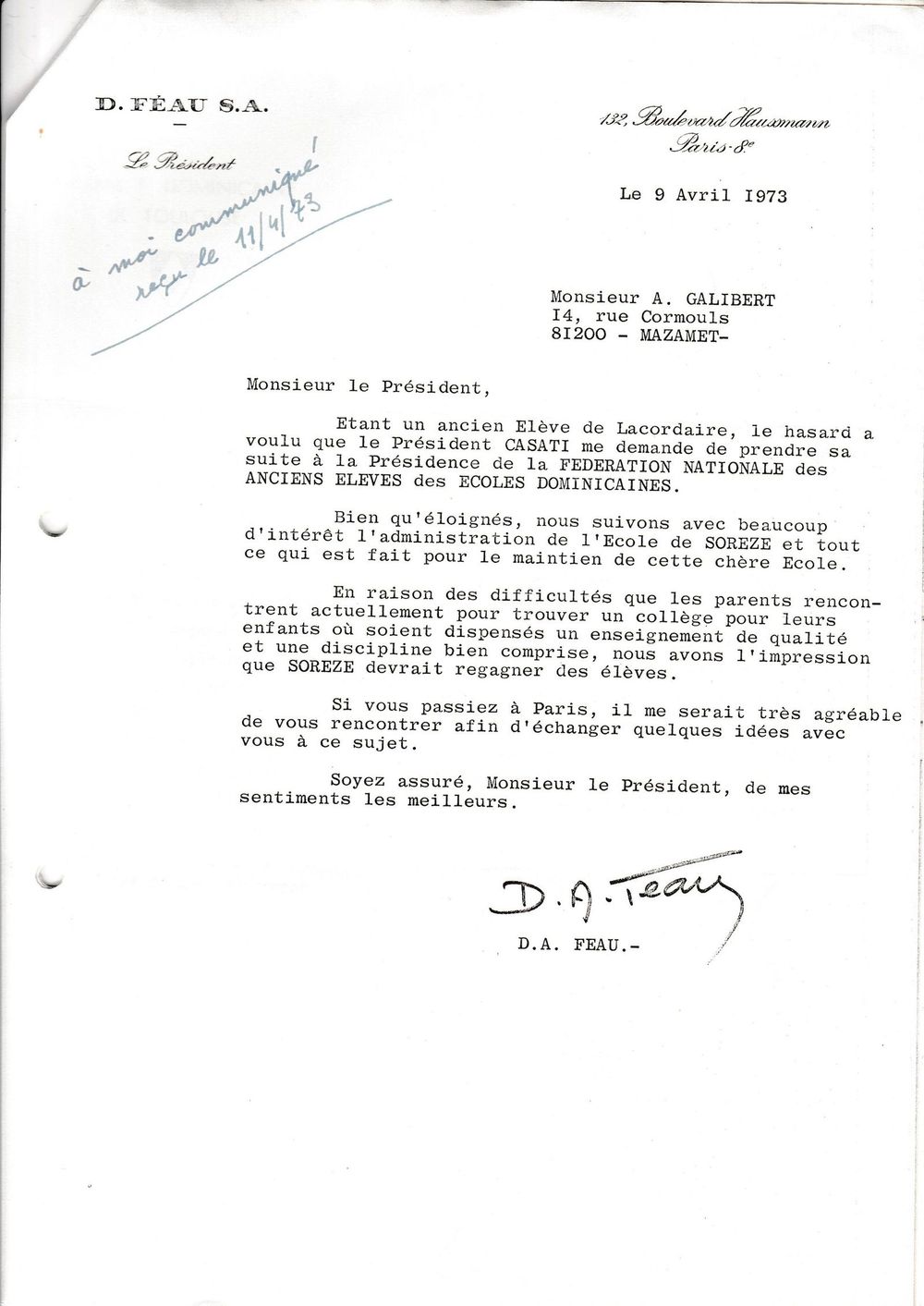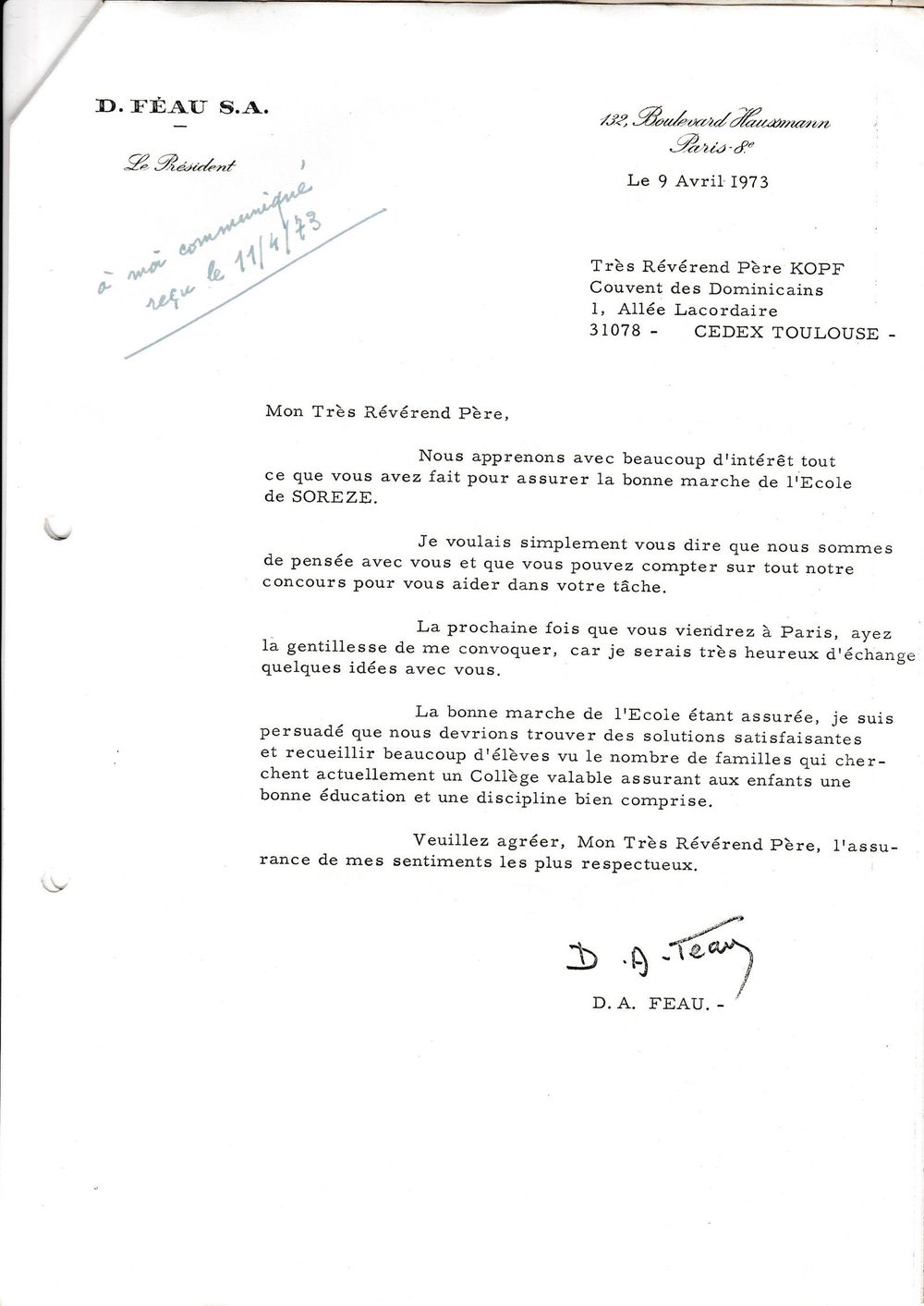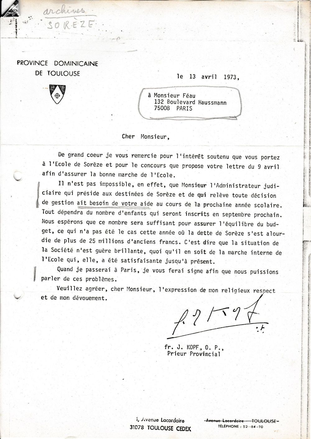 1973, 8, 9 et 13 avril,échanges entre le RP Kopf, Daniel Féau et André Galibert