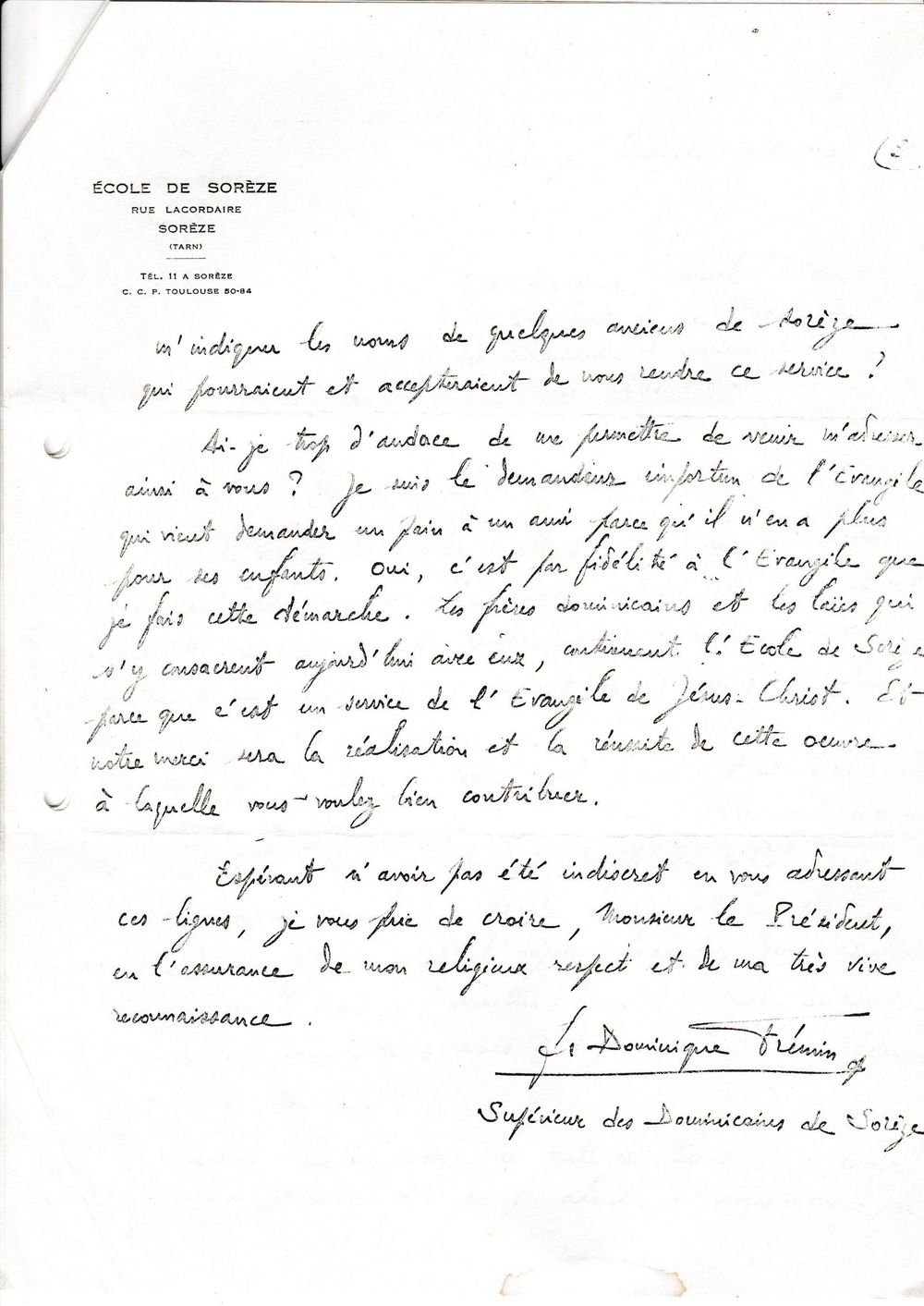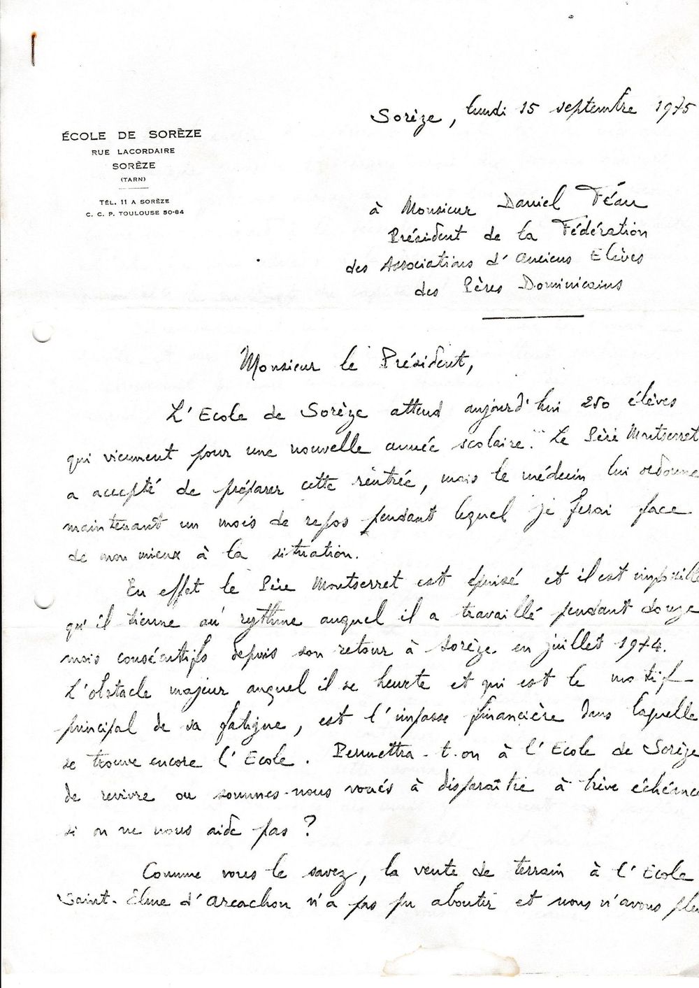 1975, 15 septembre, le RP Frémin à Daniel Féau,président de la Fédération des Associations d'Anciens Élèves des Pères Dominicains successeur de Roger Casati