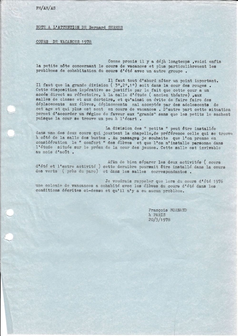 1978, 20 mars, Mornand à Bernard Serres, directeur de l'École # cours de vacances