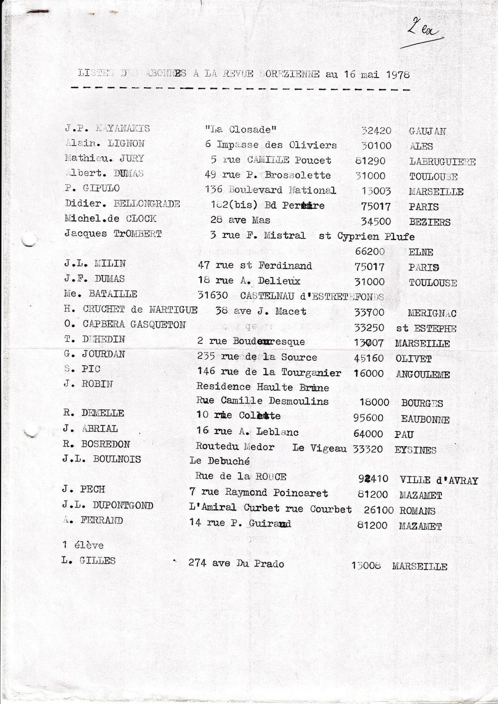 1978, 16 mai, liste des abonnés à la Revue Sorézienne