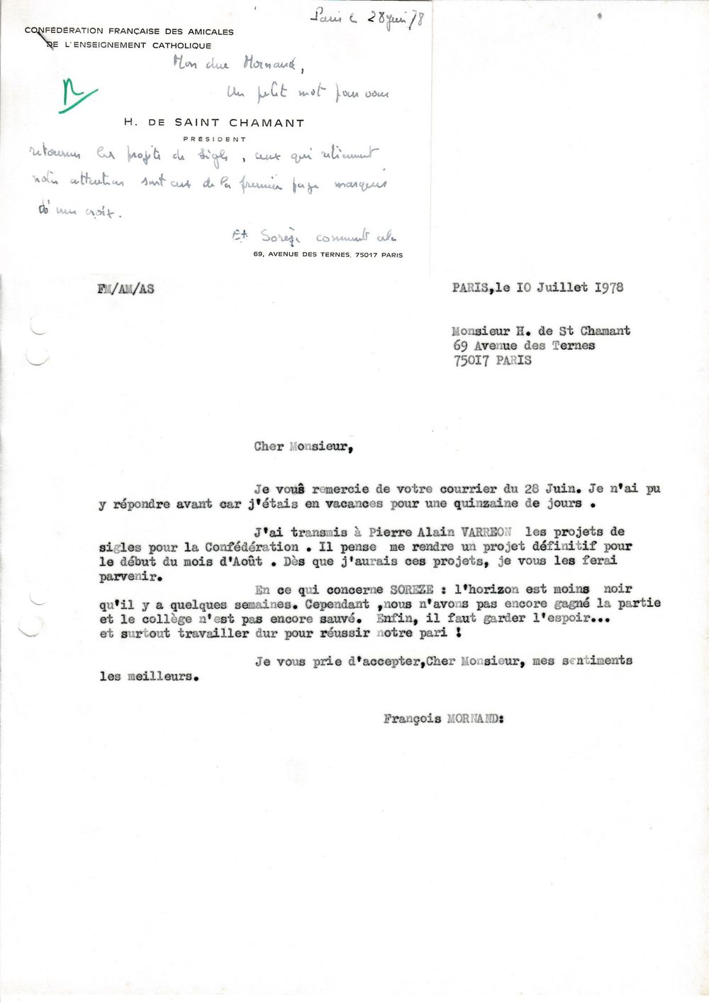 1978, 10 juillet, Mornand à H. De Saint ChamantPrésident de la Confédération Française des Amicales de l'Enseignement Catholique