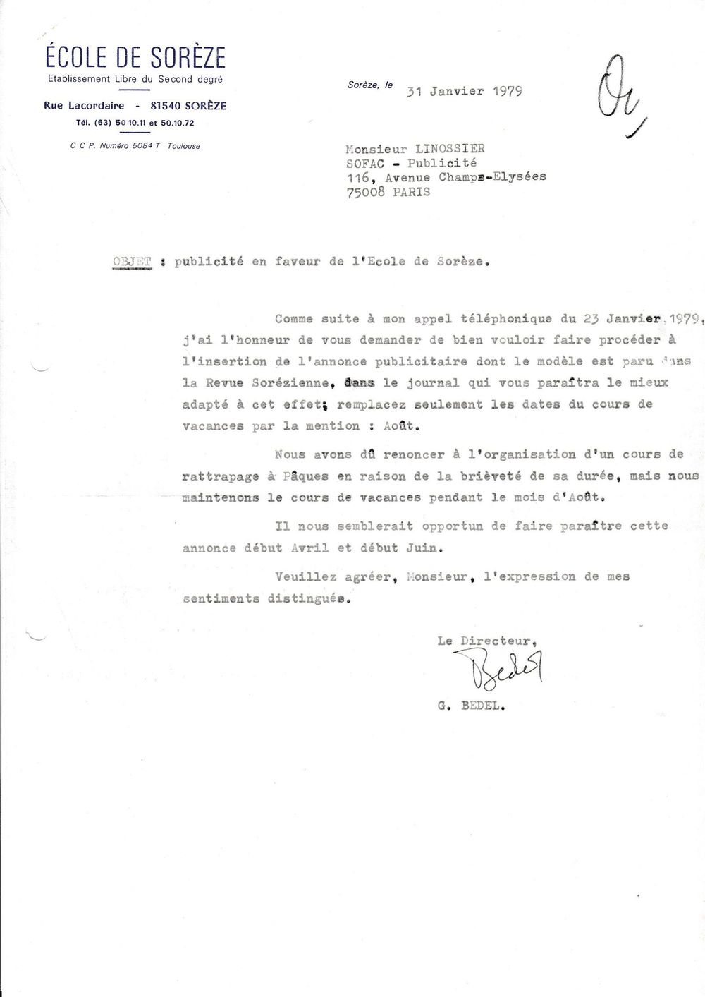 1979, 31 janvier, le directeur, Gérard Bedel, à Linossier (publicité)