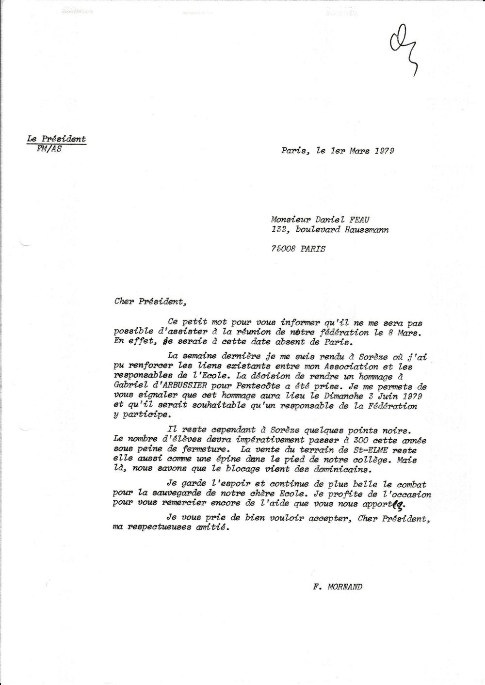 1979, 1er mars, Mornand au Président des anciens des écoles dominicaines de France