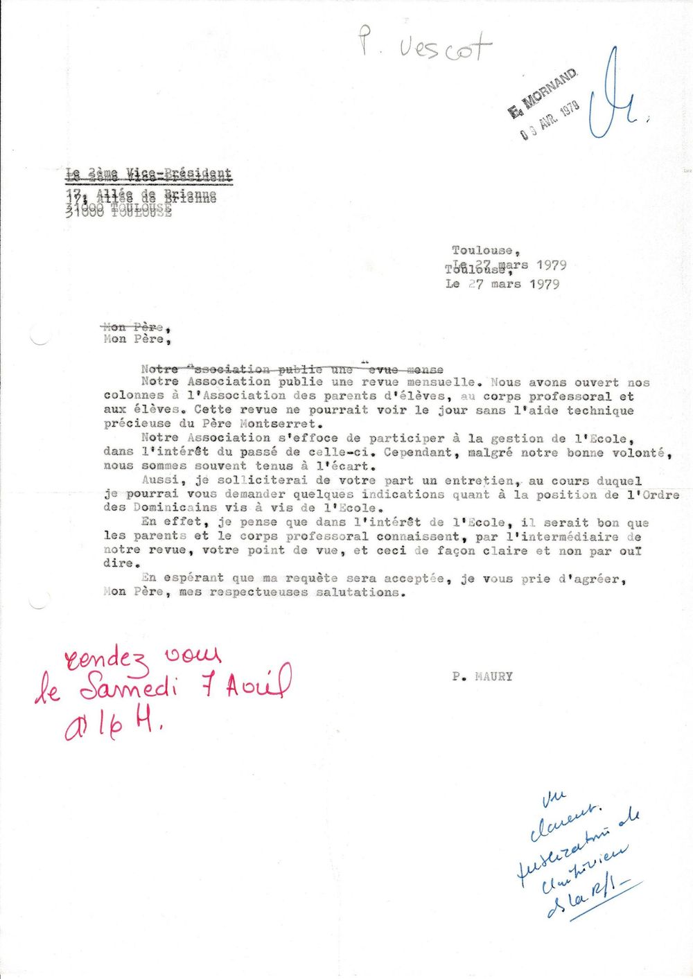 1979, 27 mars, Pascal Maury au Père Vesco, provincial