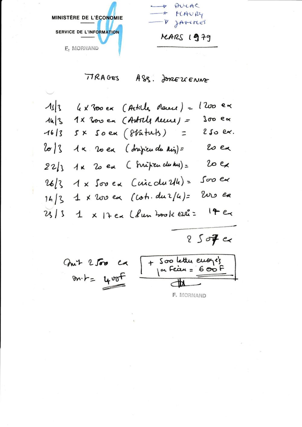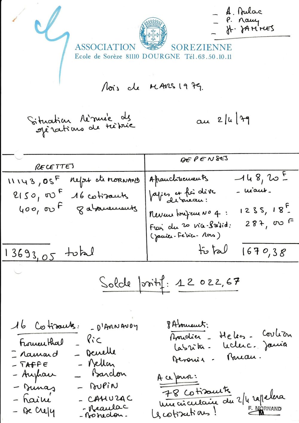 1979, mars, comptabilité de l'Association à fin mars