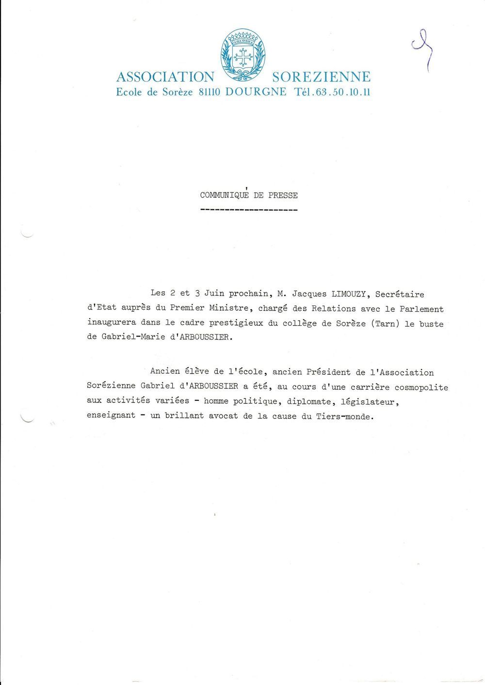 Annonce de l'inauguration du buste par Jacques Limouzy
