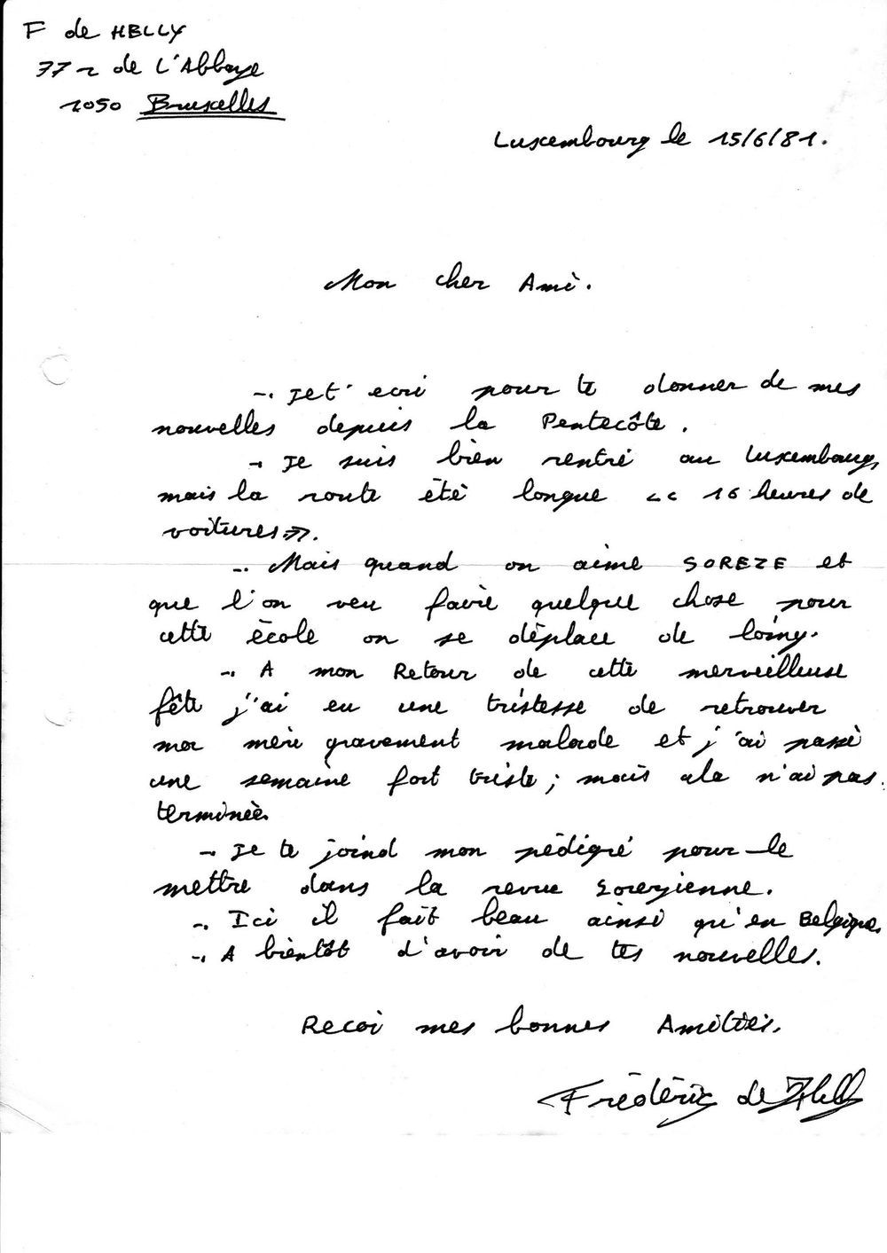 1981, 15 juin, lettre de Frédéric De Helly (53-56) pour la Revue Sorézienne