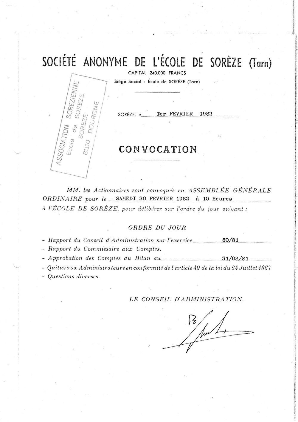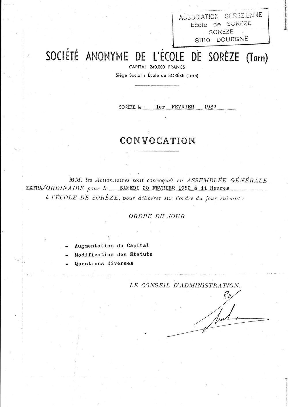 1982, 1er février,convocation à l'AG de la SA École de Sorèze
