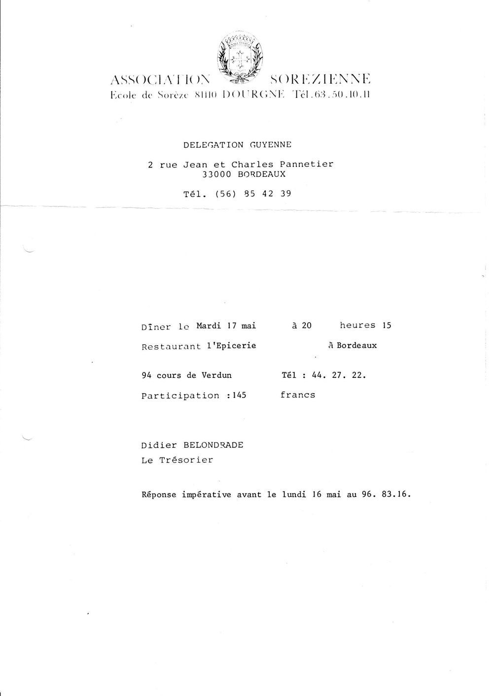 1983, mai, invitation au dîner de la délégation de Guyenne le 17 mai