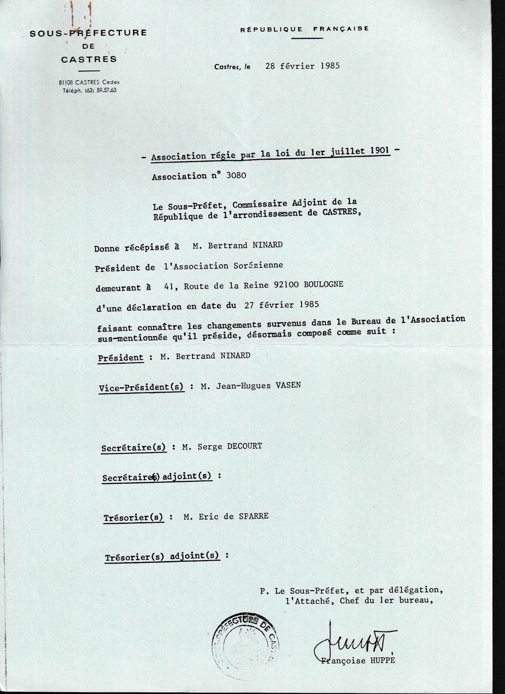 1985, 28 février, le sous-préfet de Castres enregistre le nouveau bureau