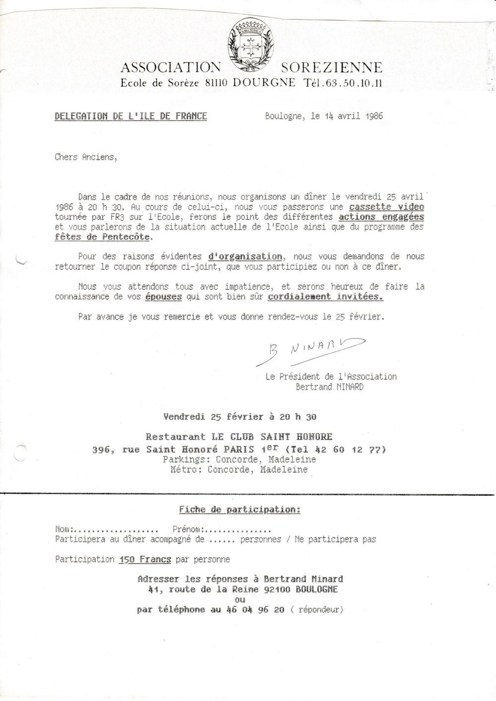 1986, 14 avril, invitation au dîner de Paris du 25 avril
