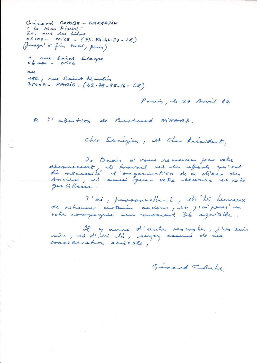 1986, 27 avril, Gérard Combe-Sarrazin (64-65), suite au dîner du 25