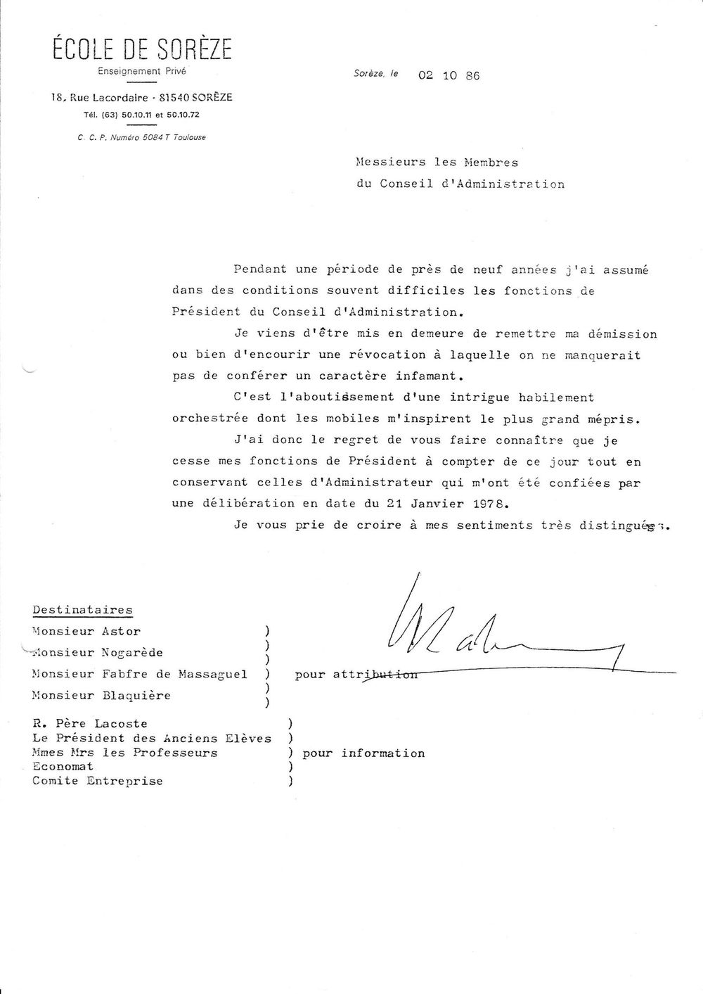 1986, 2 octobre,lettre de démission du Colonel Ramon du CA de l'École
