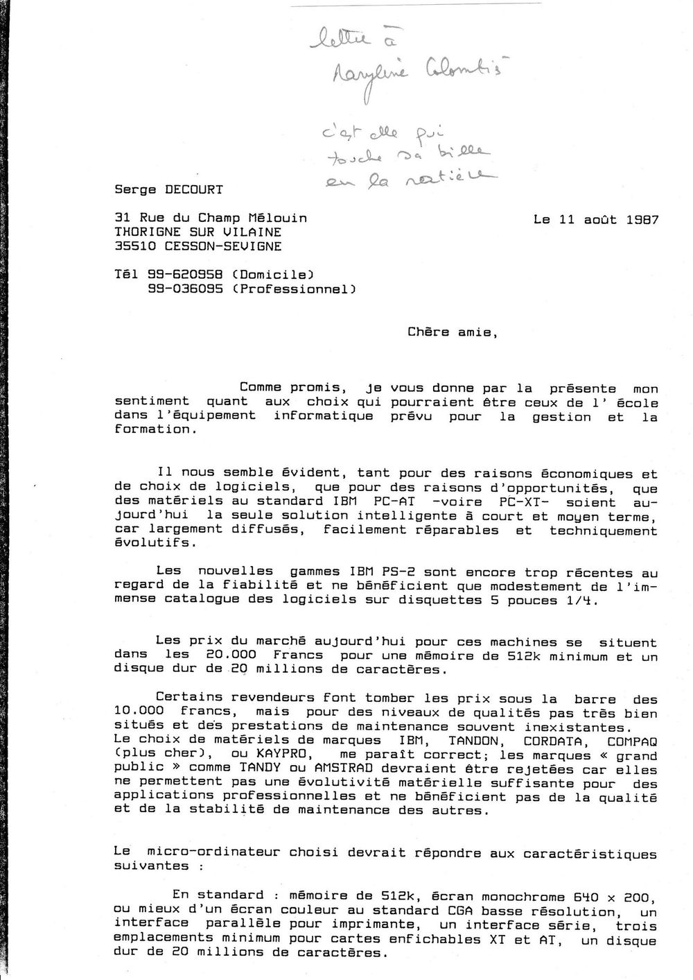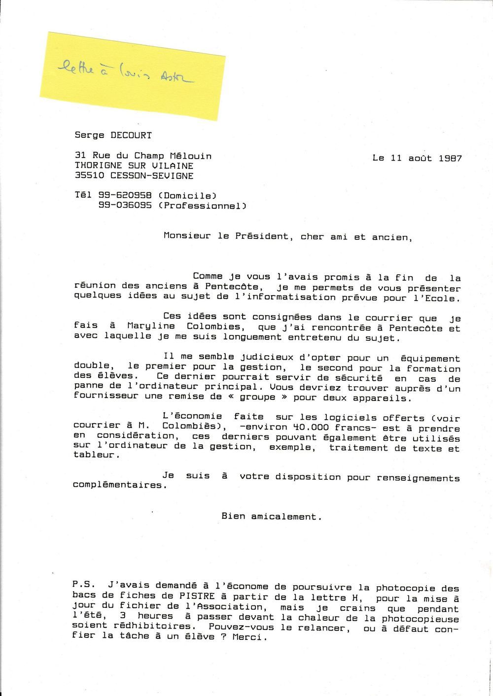 1987, 11 août,Decourt au président du CA, Louis Astor,et à Marie-Lise Colombiès