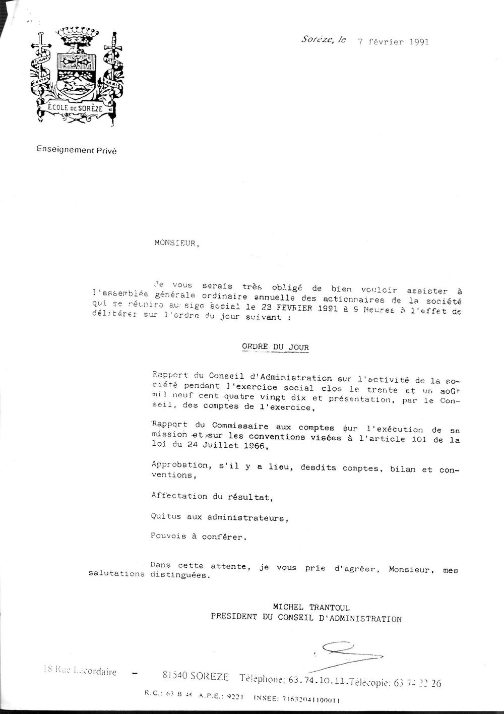 1991, 7 février, Trantoul aux actionnaires de la SA