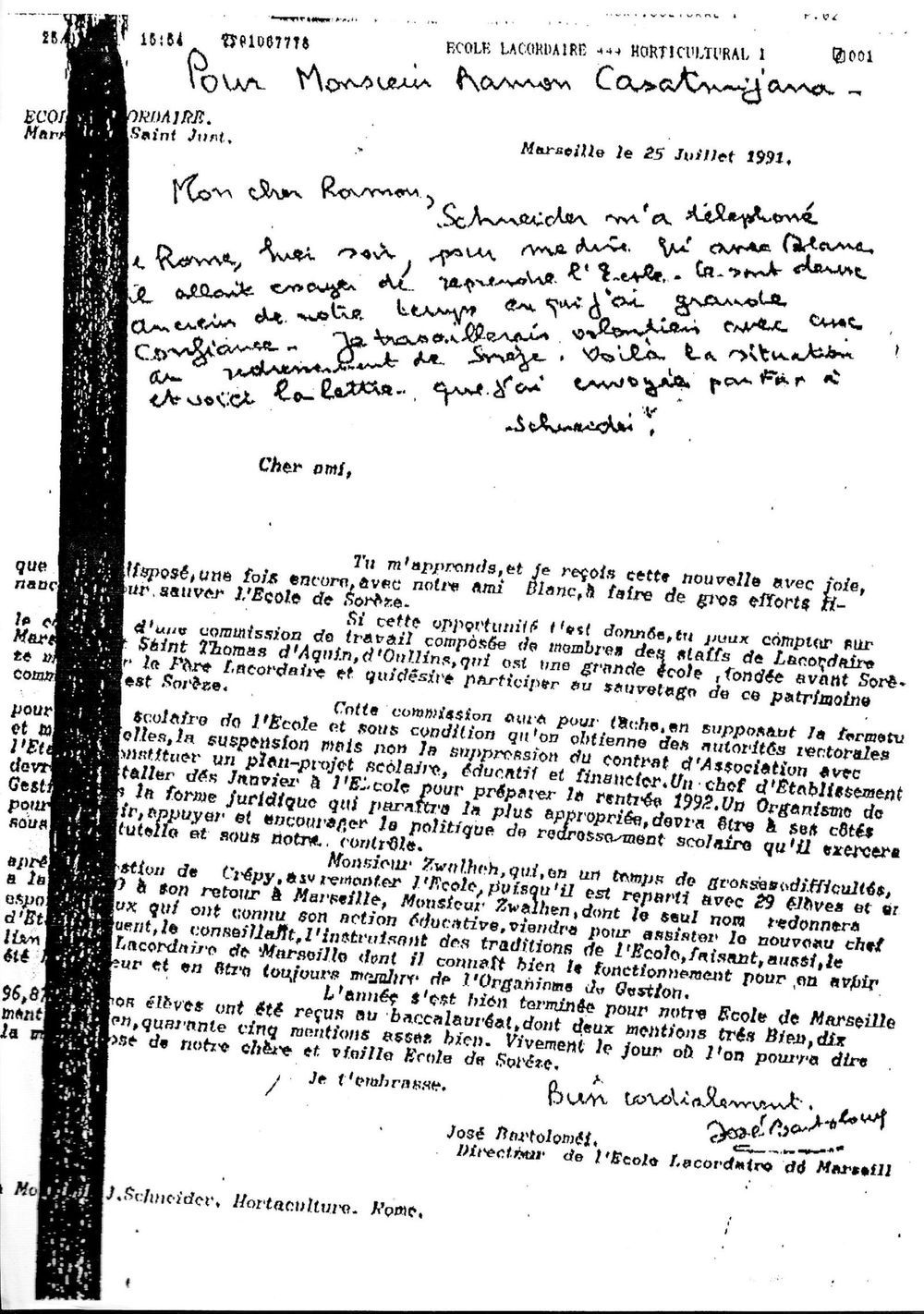 1991, 25 juilletlettre de Bartolomeï àJacques Schneider (58-63) et Ramon Casamitjana (51-58)