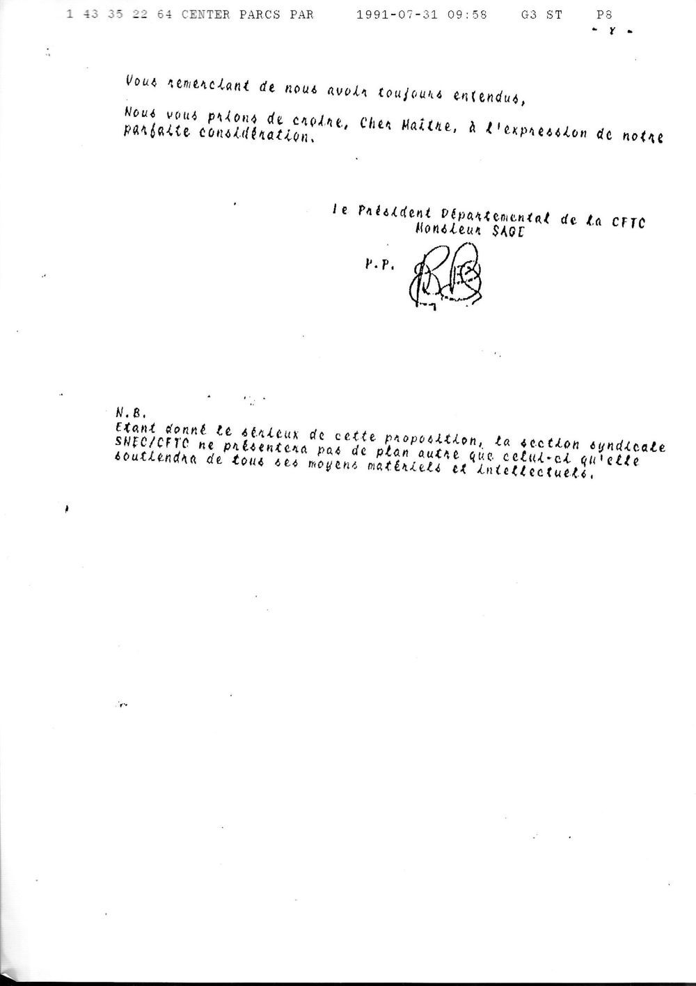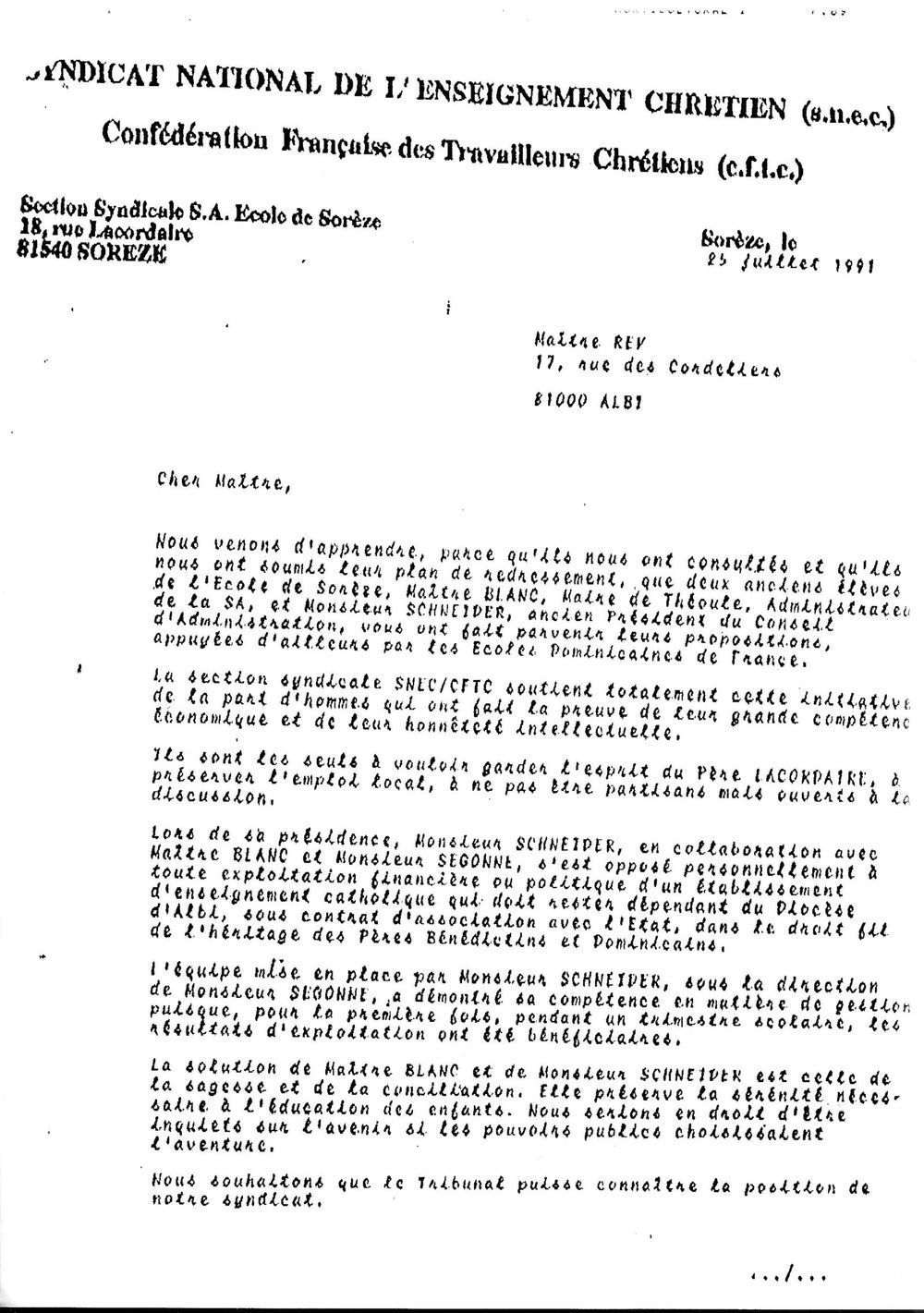 1991, 25 juillet, le SNEC à Maître Rey, administrateur judiciaire