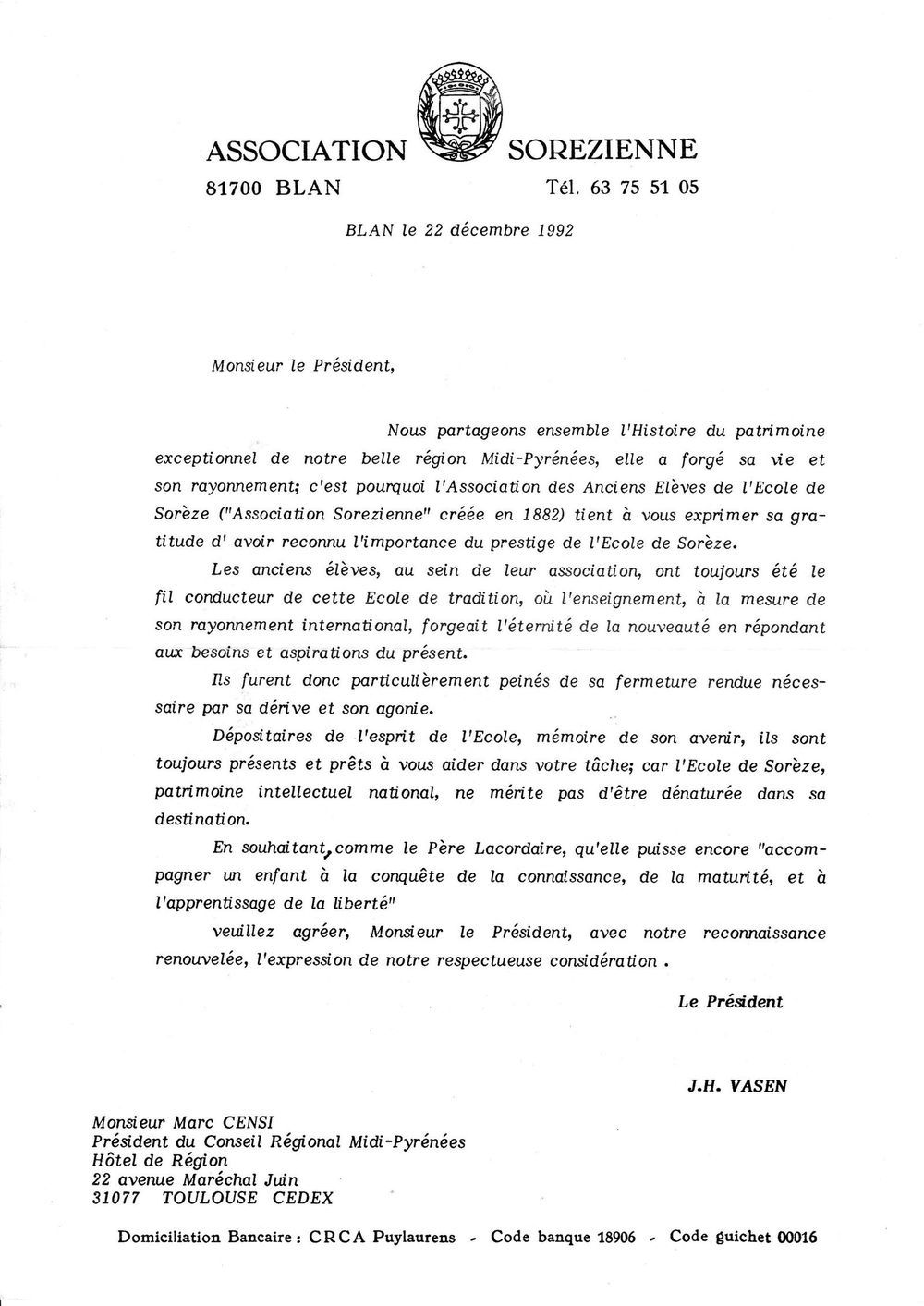 1992, 22 décembre, lettre de Vasen aux anciens et au Conseil Régional
