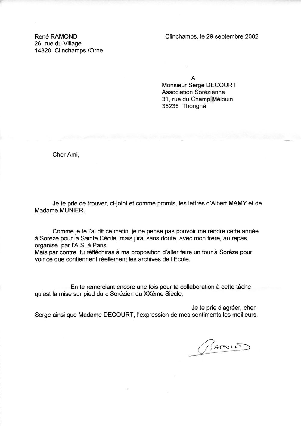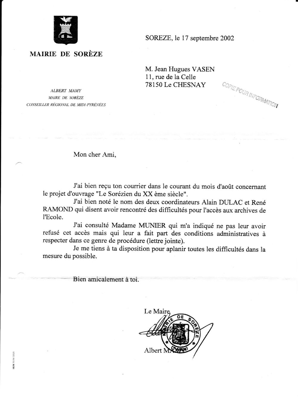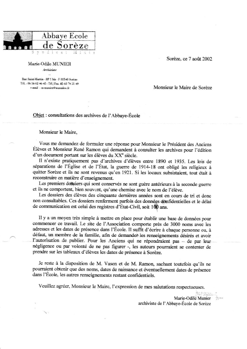 2002, août-septembre, échange entre l'archiviste, la mairie, et l'Association