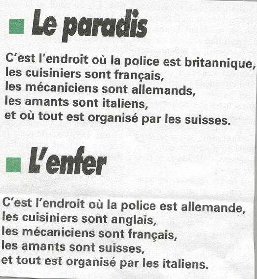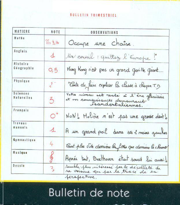 Je n'ai pas assisté à beaucoup de courses de spermatozoïdes mais j'ai donné beaucoup de départs". (L'amiral, alias Olivier DE KERSAUZON) L'amour c'est un sport. Surtout s'il y en a un des deux qui ne veut pas". (Jean YANNE) Le Bois de Boulogne est le seul endroit où, quand tu donnes un coup de pied dans un buisson, il te le rend." (POPECK) La connerie est la décontraction de l'intelligence". (Serge GAINSBOURG) Les fonctionnaires devraient arrêter de travailler le matin ; ils ne savent plus quoi faire l'après-midi". (COLUCHE) Le véritable égoïste est celui qui ne pense qu'à lui quand il parle d'un autre" (Pierre DAC) L'accouchement est douloureux. Heureusement, la femme tient la main de l'homme. ainsi, il souffre moins" (Pierre DESPROGES) L'amour rend fou. Il n'y a que la guerre qui Rambo". (COLUCHE) La dictature : c'est "ferme ta gueule ", la démocratie c'est "cause toujours" (Woody ALLEN) Le jour où la merde vaudra de l'or, les pauvres naîtront sans trou du cul". (COLUCHE) |