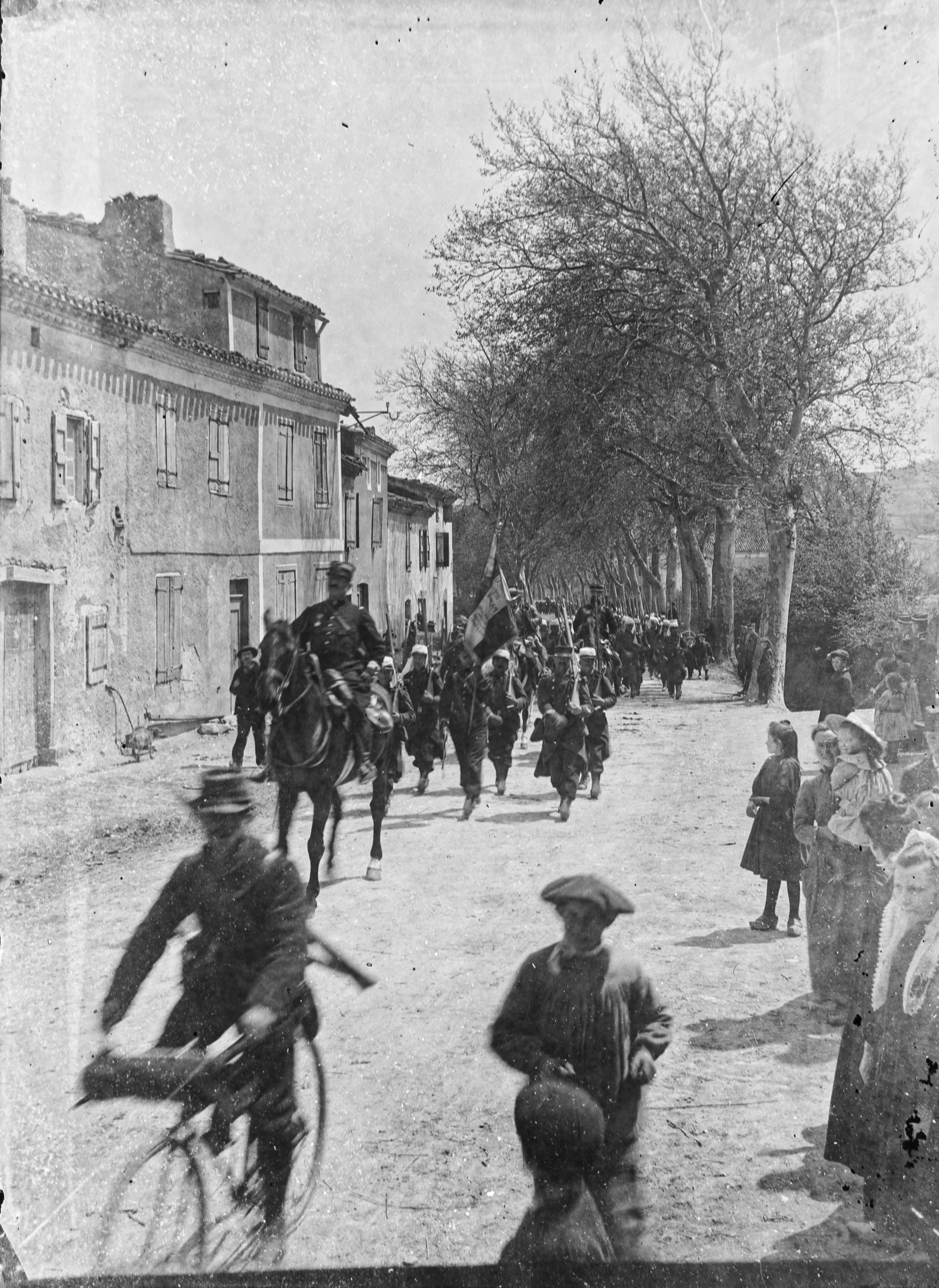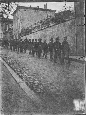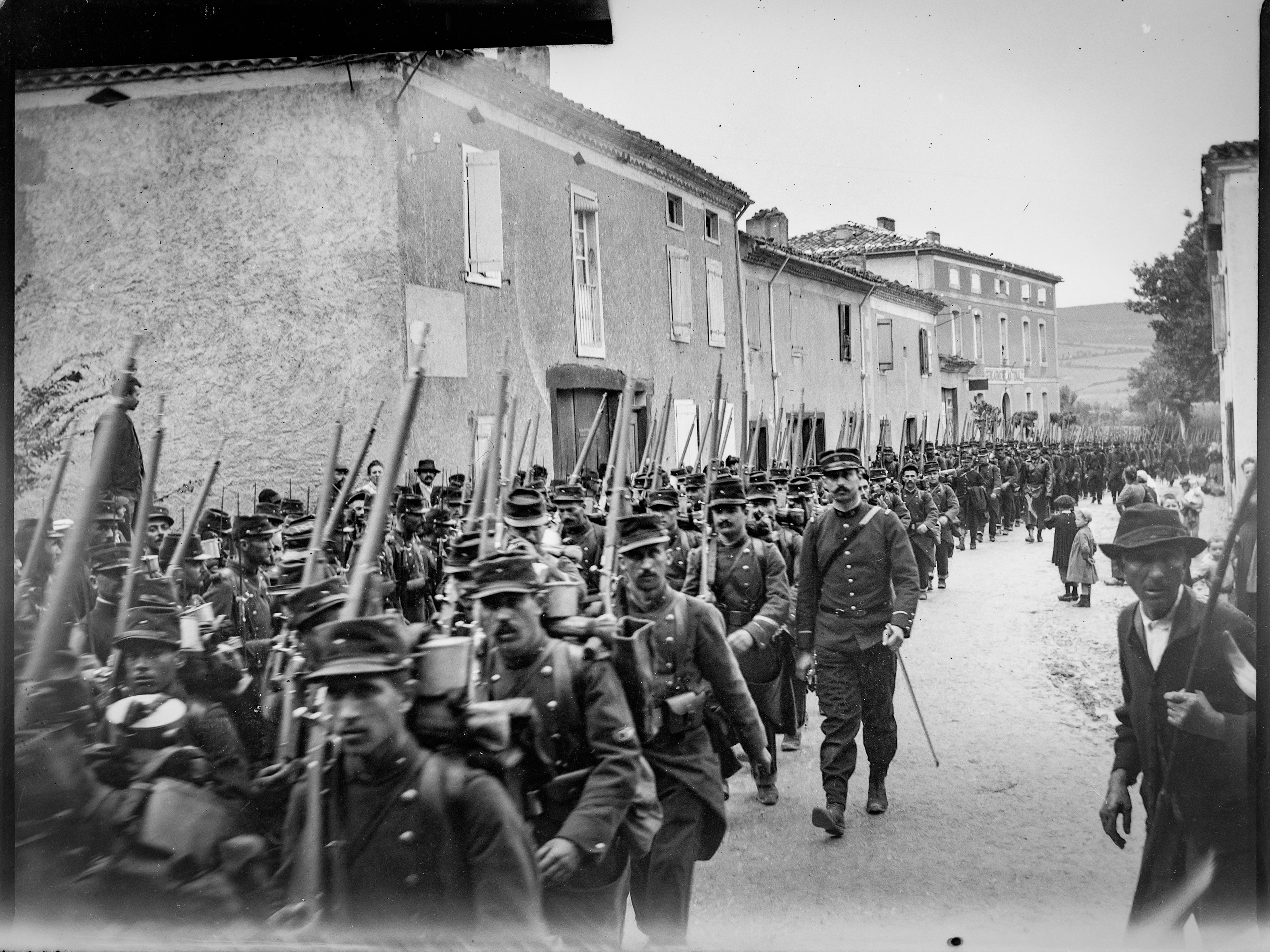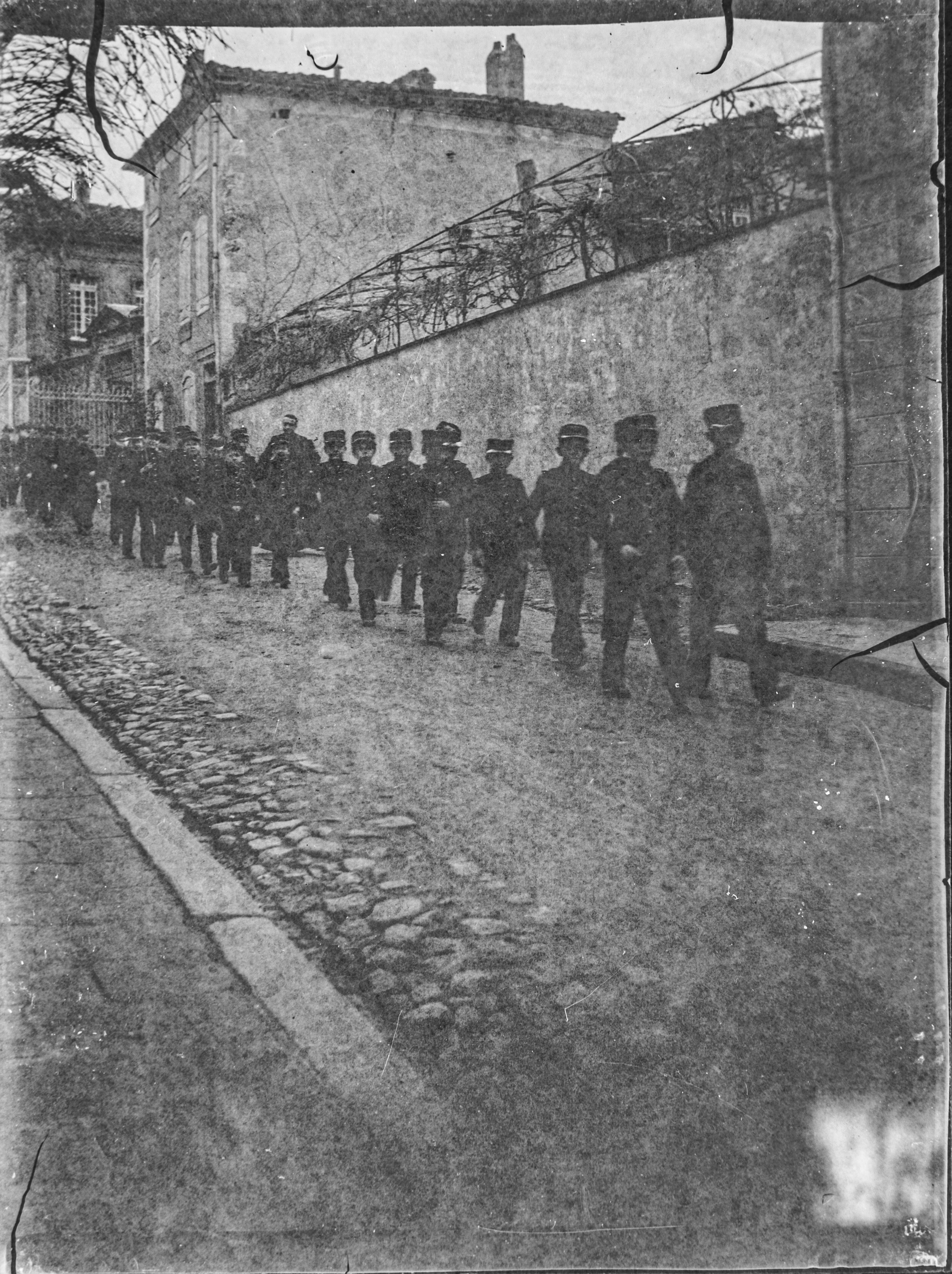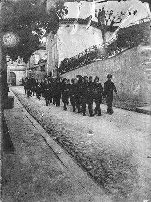 Les soldats arrivent à pieds par la route de Dourgne