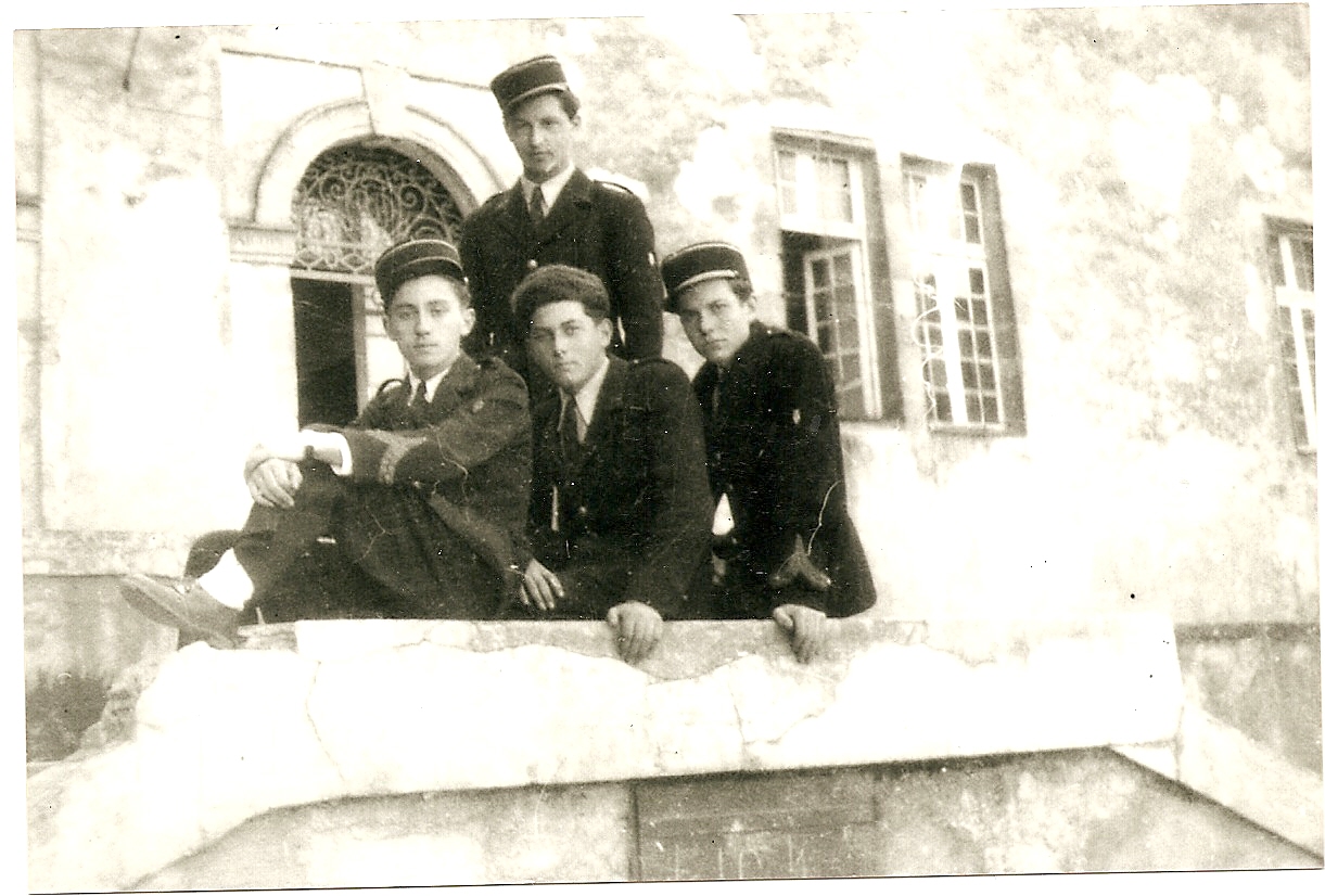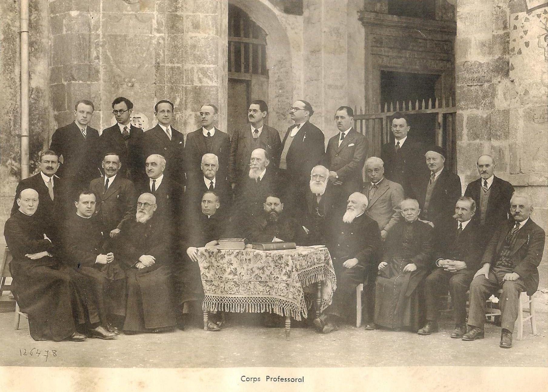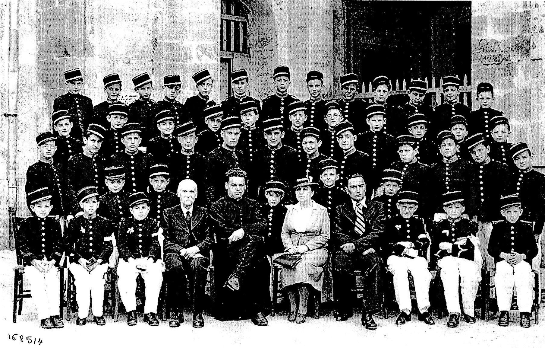 | 1er rang à partir de la gauche : Le Père CAZES (2ème) Le père AUDOUARD (5ème) Monsieur CAMMAS économe (8ème) 2ème rang à partir de la gauche : Monsieur FRAISSÉ prof de maths (6ème) Monsieur AUSSAGUEL économe (8ème) 3ème rang à partir de la gauche : Monsieur BARRIERE (2ème), Monsieur DAUNIS prof de français (5ème), Monsieur LESTARPE sous-censeur et concierge (6ème). ![]() Une autre du corps professoral | La remise du drapeau | Pierre Terry et le père Audouard | Philo-Maths | 1ère | 1ère avec les noms | 2onde | debout