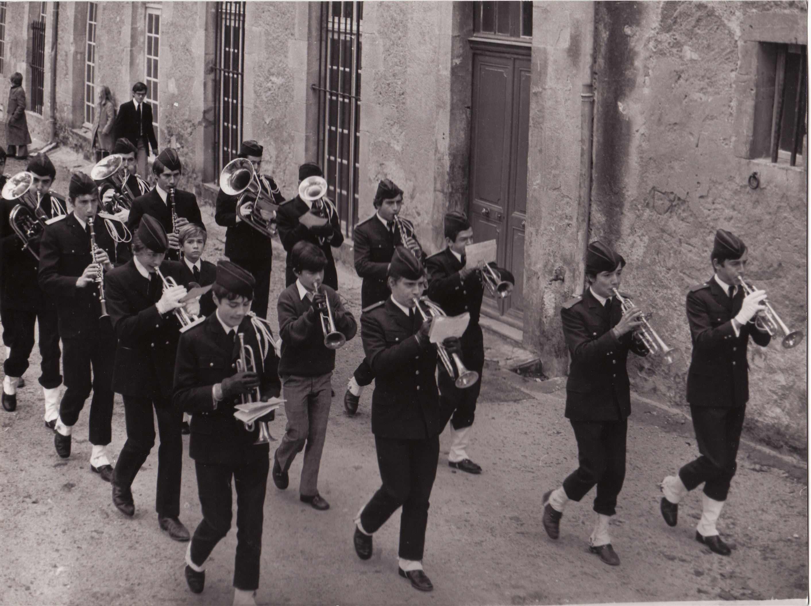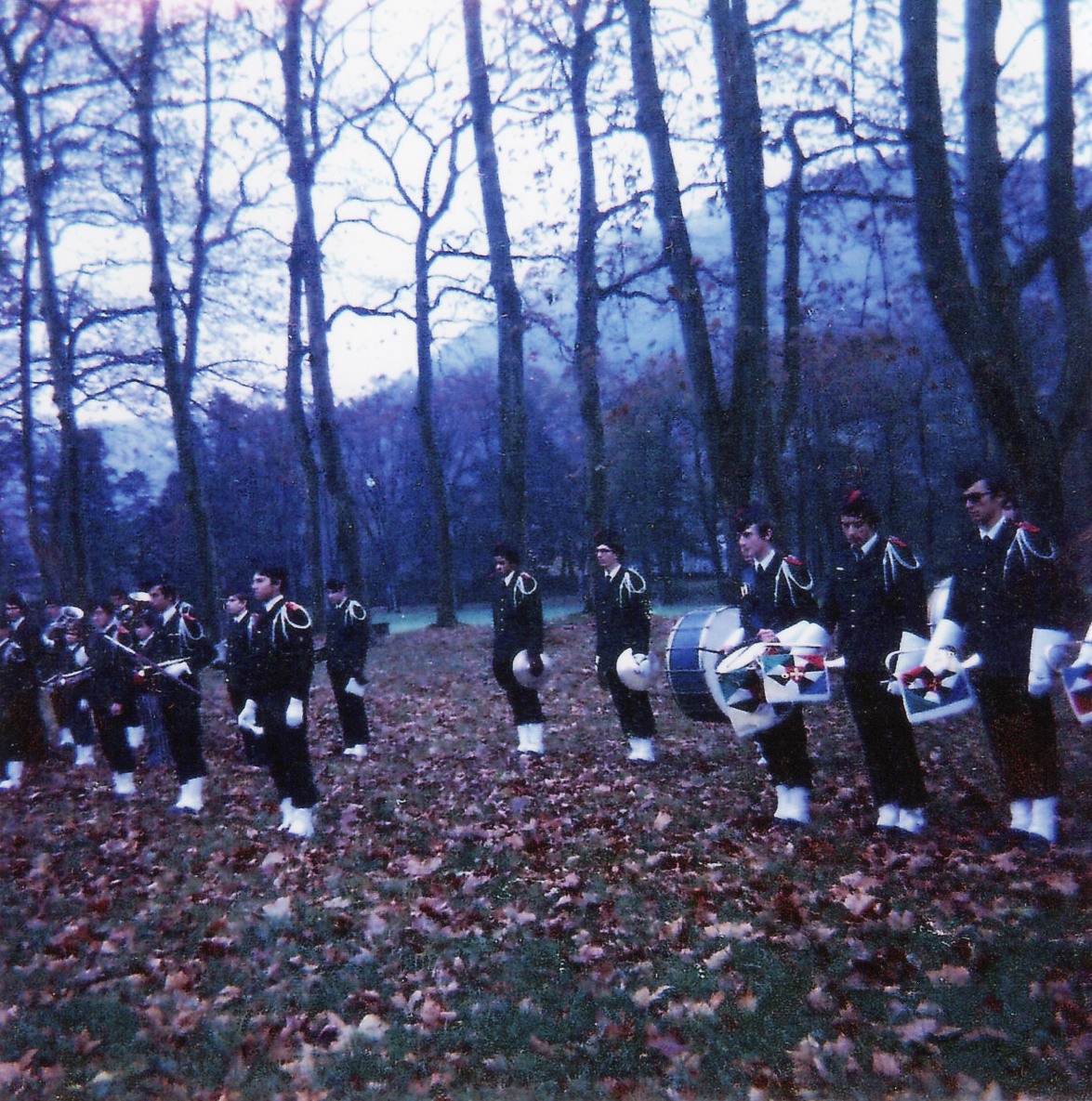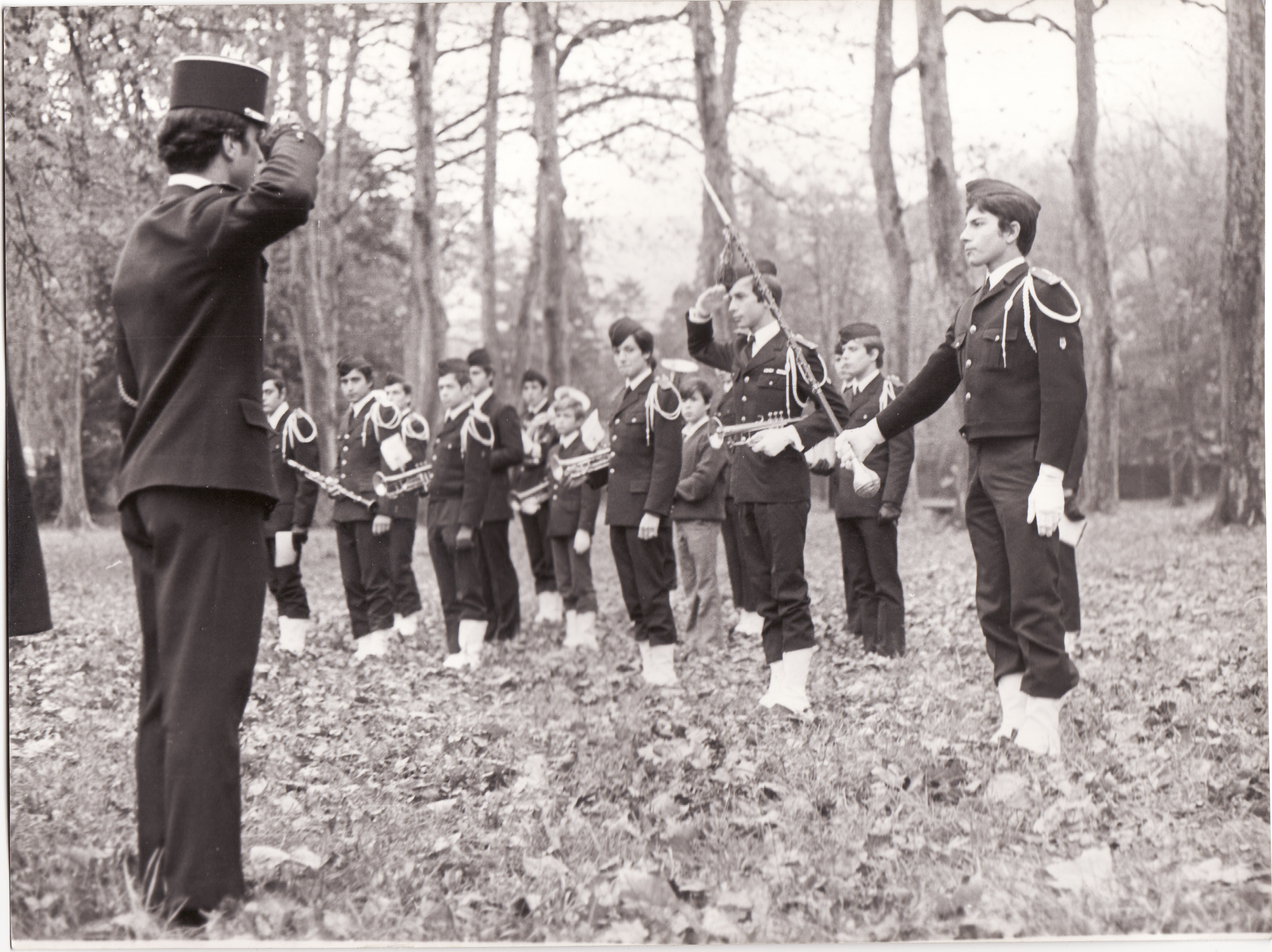 | 71, Sainte Cécile, l'état-major, de gauche à droite : Jean-Jacques Subiros, chef de fanfare, Jean-Edmond Sales, maître des cérémonies, Bernard Sudre sergent-major, Bernard Molinier, porte-drapeau