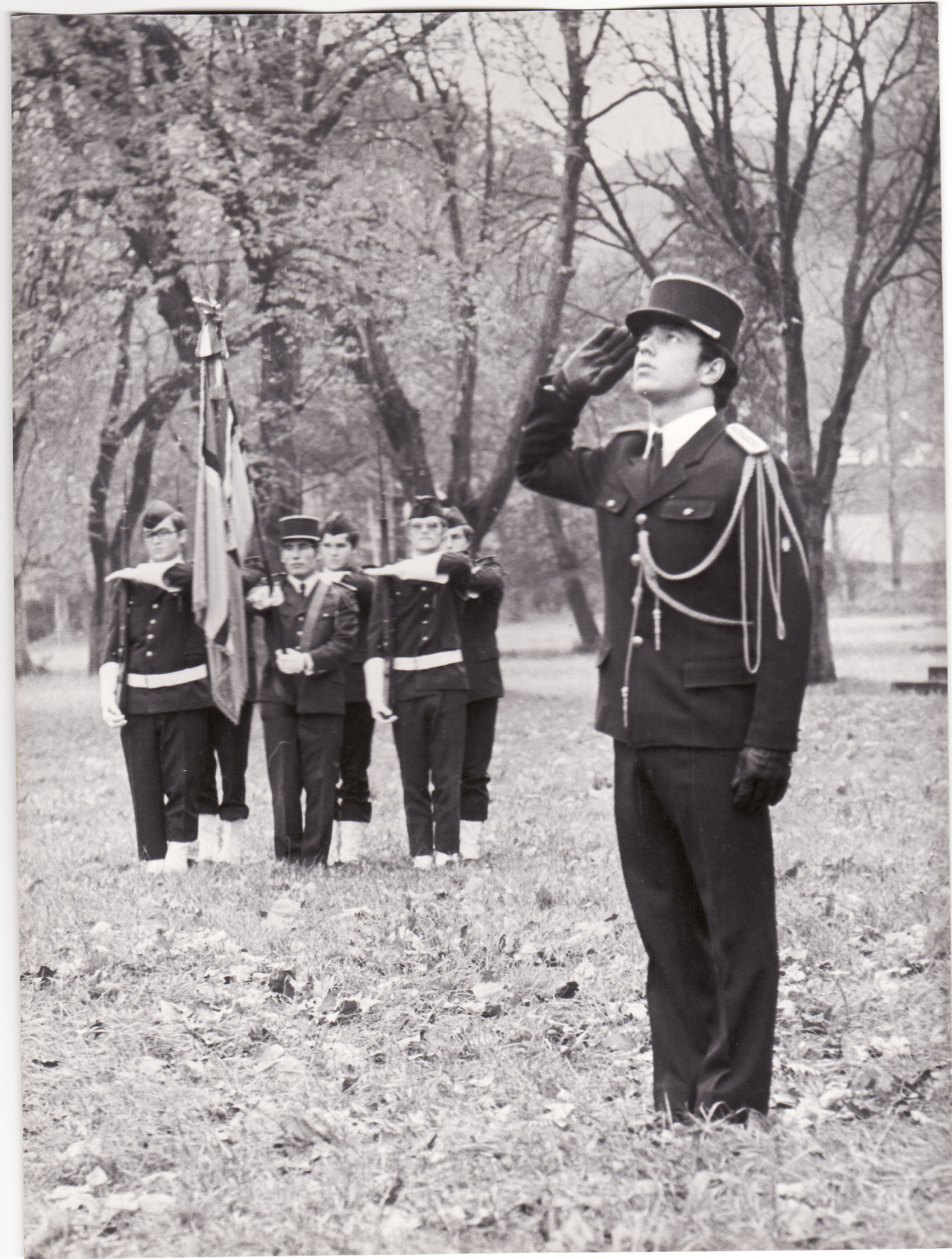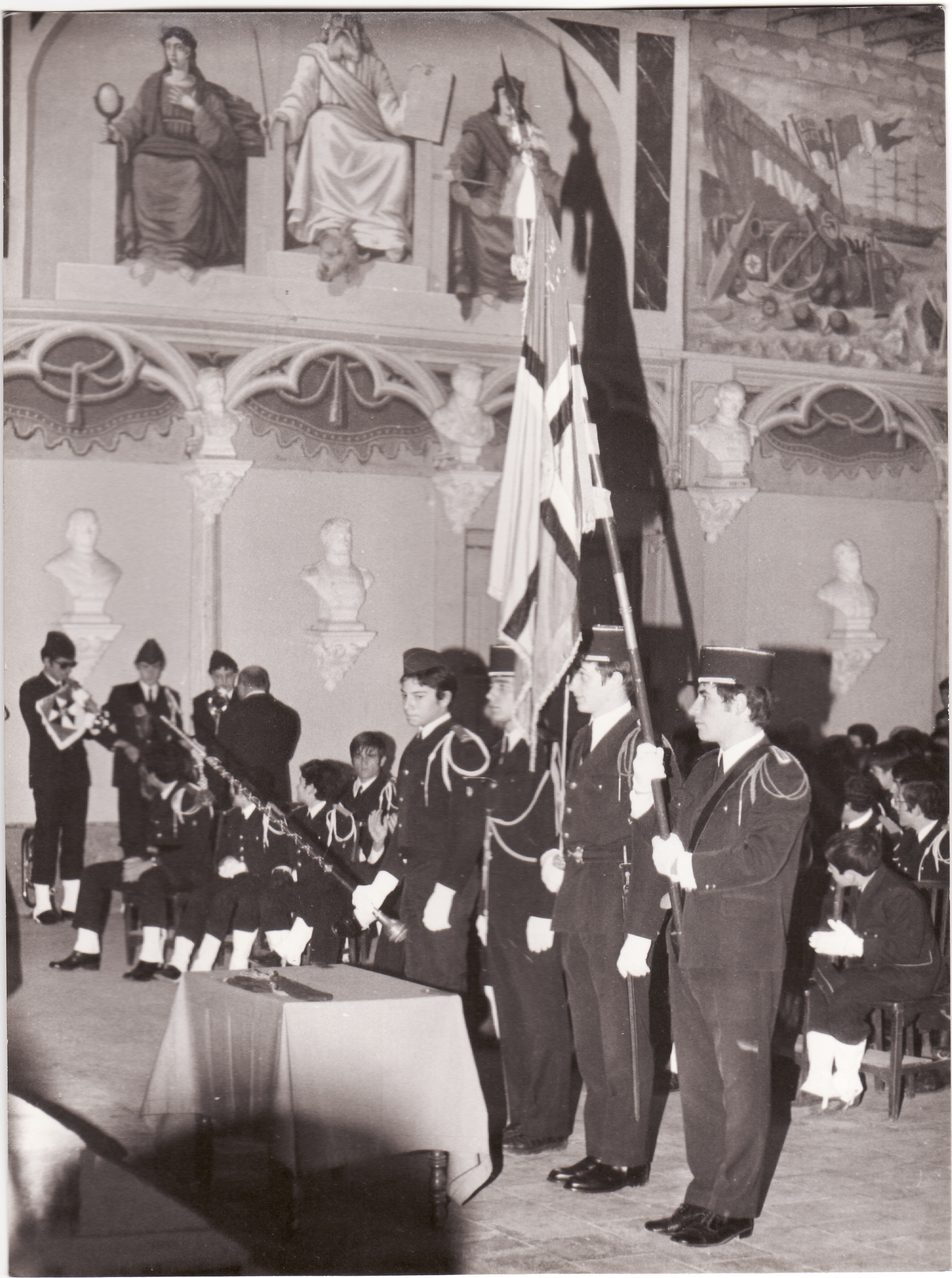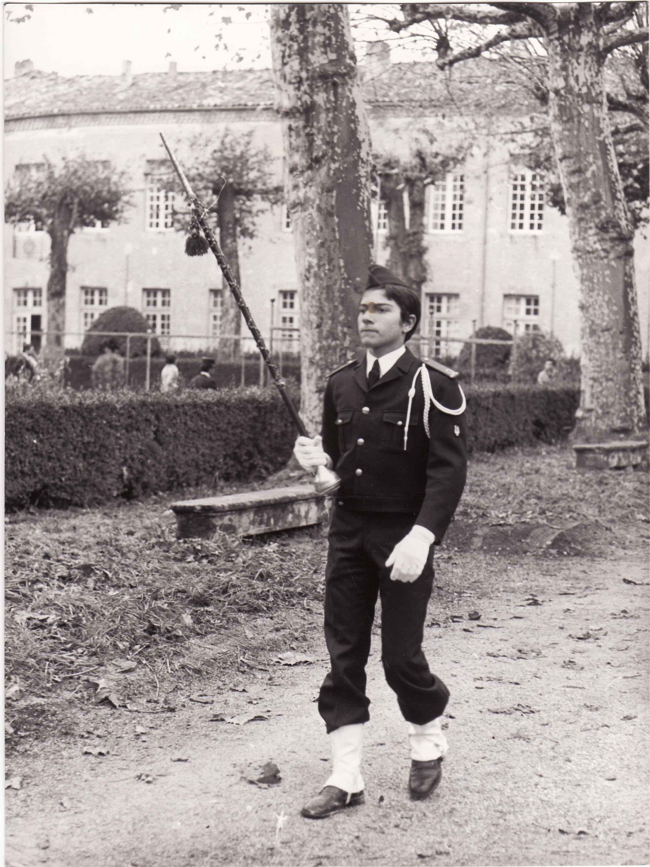 | 71, Sainte Cécile, l'état-major, de gauche à droite : Jean-Jacques Subiros, chef de fanfare, Jean-Edmond Sales, maître des cérémonies, Bernard Sudre sergent-major, Bernard Molinier, porte-drapeau