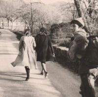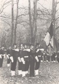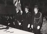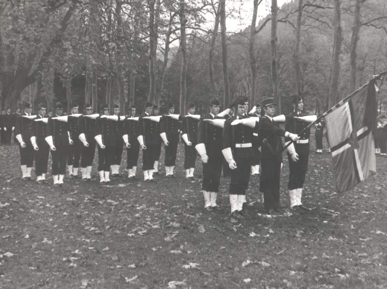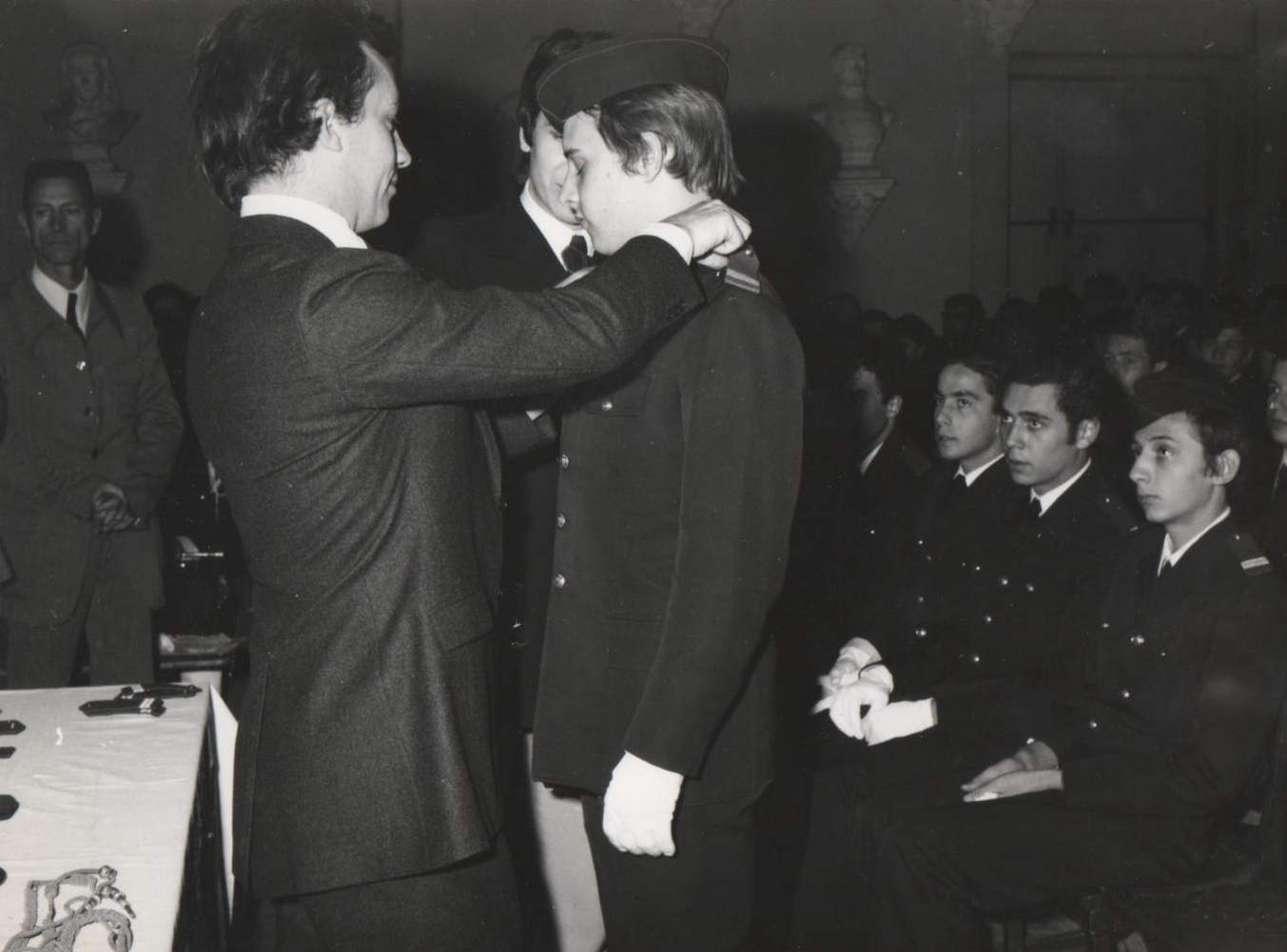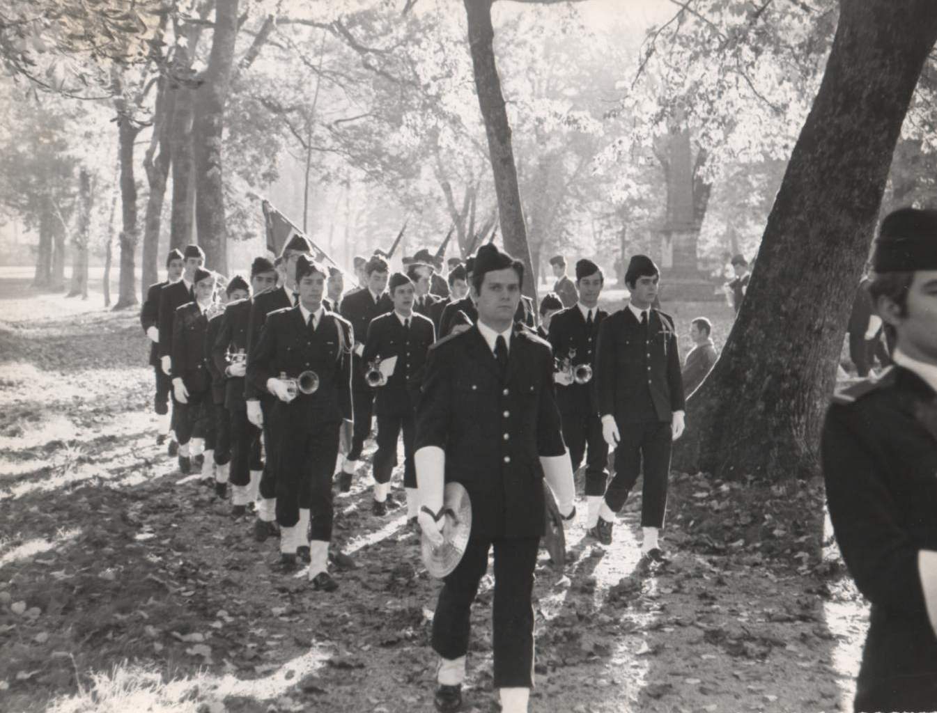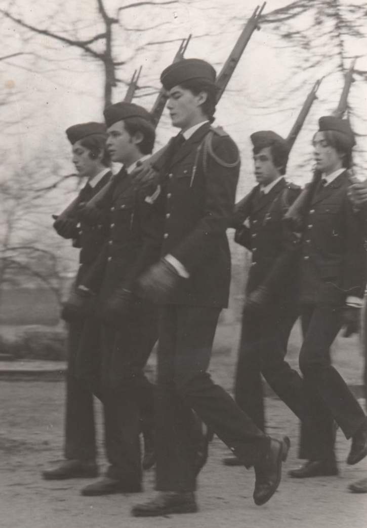 | ![]() 1973 Pentecôte, entrée cour d'honneur, Gilles DODEUR chef du Peloton, Philippe SAPPEY et Christian JEANNEROT. De dos Jean-Marc PEZET chef des Rouges