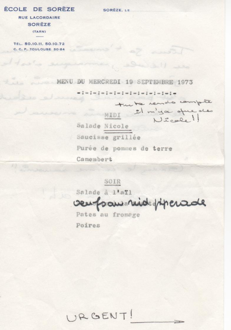 | ![]() 1973 septembre, menu qu'avait envoyé SOMMAY à PEZET... le prénom de NICOLE lui plaisait et la cousine de PEZET du même prénom encore plus !!!