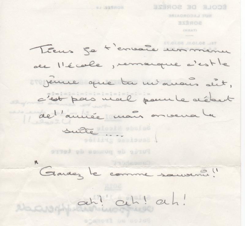 | ![]() 1973 septembre, annotations de SOMMAY... Pour les anciens de 73, Mr COULON n'avait pas apprécié le paté CANIGOU sur tranche de pain ! Et pourtant il avait fait DIEN BIEN PHU !