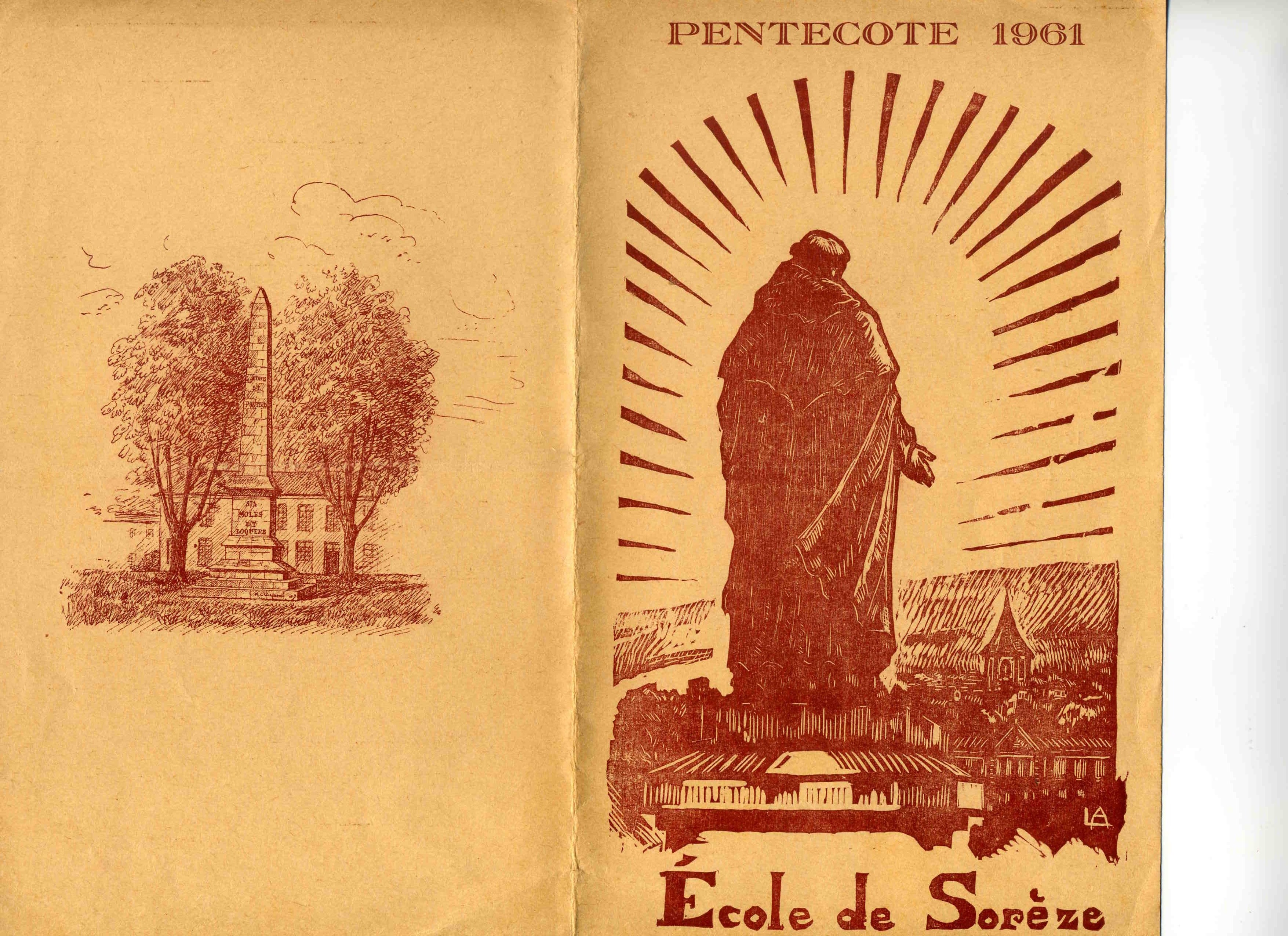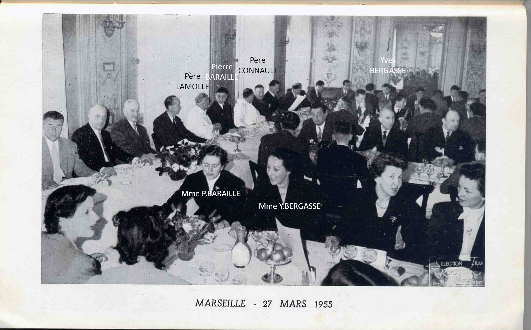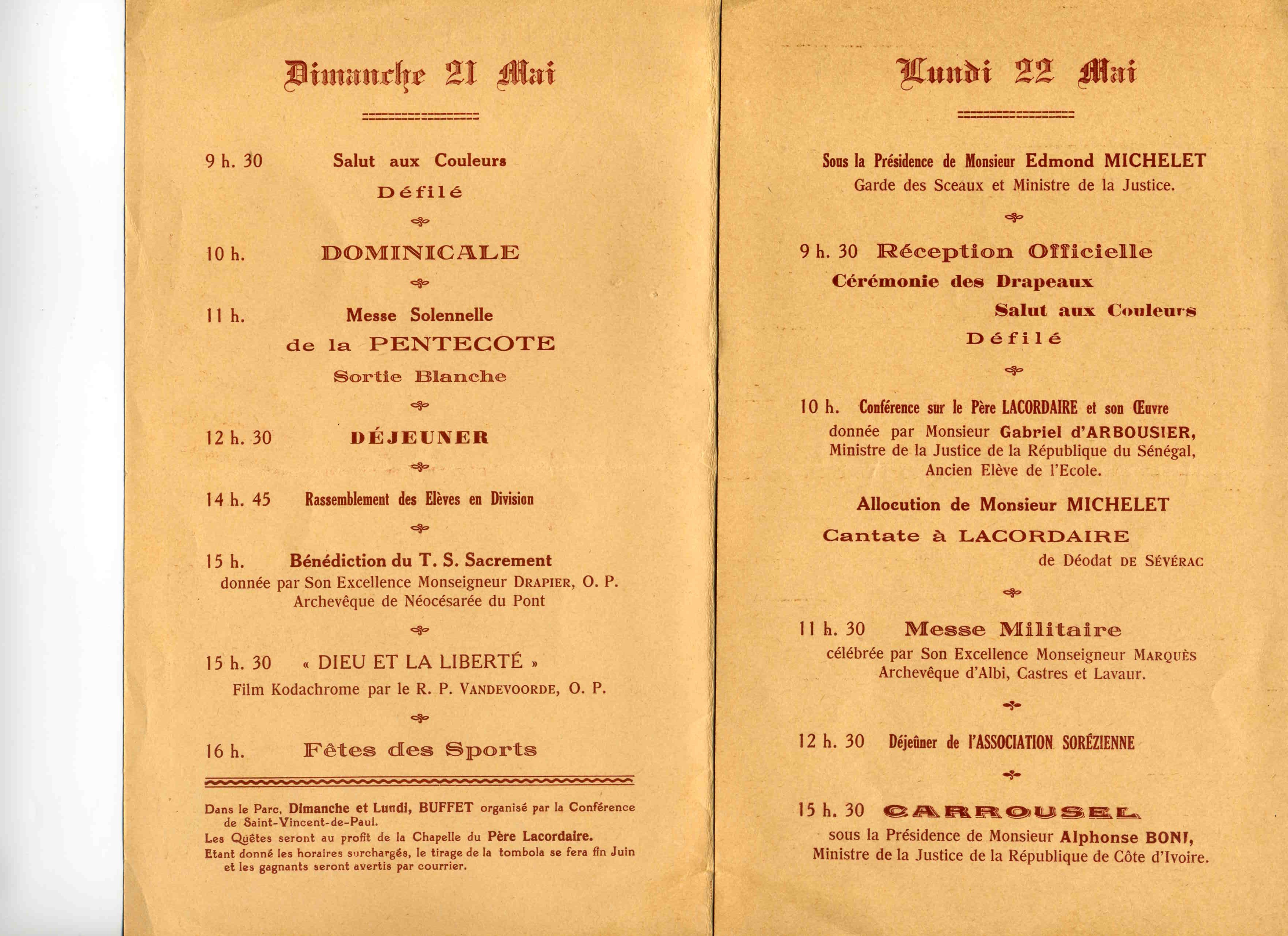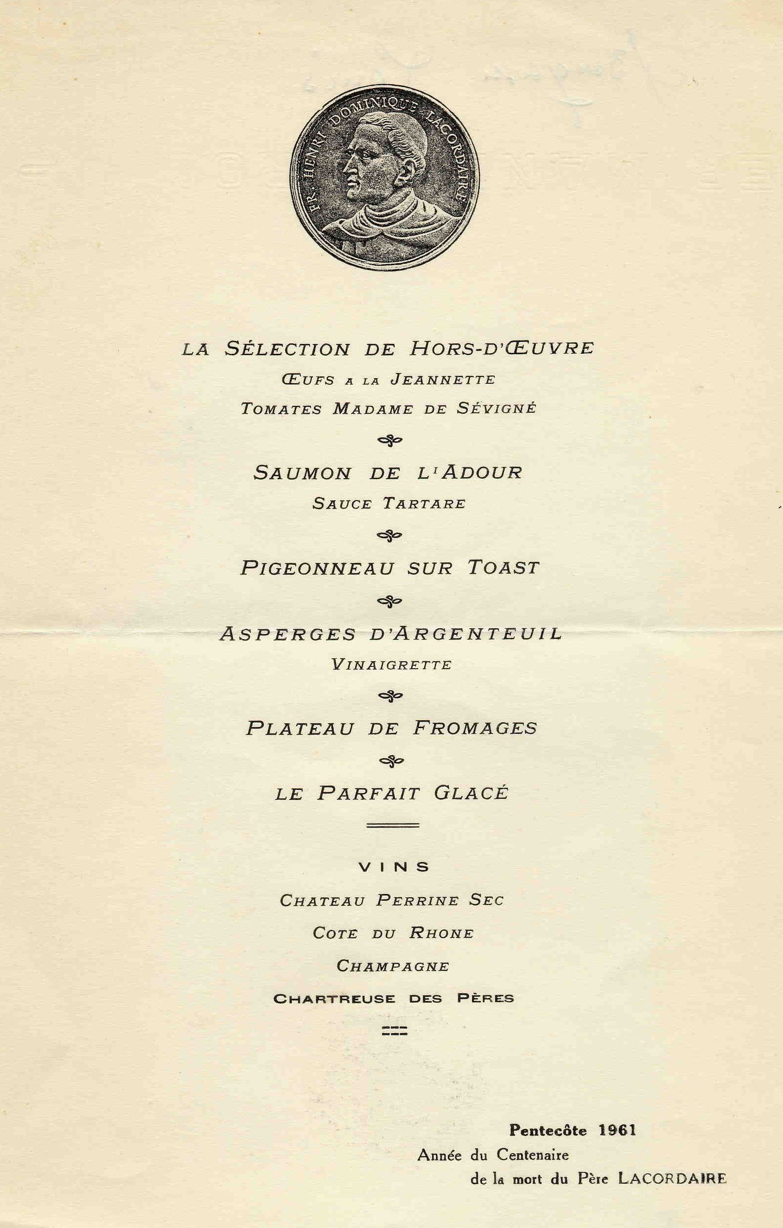 | ![]() Sainte Cécile 1960 | le drapeau (il faisait un très très véhément vent d'autan) 1er rang : Jacques Rougé, Gaston Bergasse, Xavier Flamand 2ème rang : Riba à droite ? ![]() Notre Etat Major a géré les festivités du « Centenaire de la mort du Père Lacordaire », dont j'ai retrouvé la description de la fête de la St Cécile, le 21 novembre 1960. Certaines des photos s'expliquent : | -L'état Major a été nommé auparavant, peut être la veille. Mon père me remet le drapeau le 20 novembre .. -L'attente dans la cour d'honneur est pour la réception de toutes les personnalités décrites dans le fascicule ci-joint, en page 1 et 2 -Le lever aux couleurs entre Louis XVI et l'obélisque -Un discours dans la salle des bustes « Pourquoi Lacordaire est-il venu à Sorèze » -La messe -Un repas (lecture d'une lettre de Son Excellence H.OUEDRAOCO, Ministre de Haute-Volta et Maire de Ouagadougou ! Avez-vous la réponse pourquoi lui ?), plusieurs orateurs anciens élèves, puis le préfet pour clôturer la journée ! ![]() Pentecôte 1961 | Le programme ![]() Pentecôte 1961 | ![]() Pentecôte 1961 | ![]() Pentecôte 1961 | Le menu du banquet ![]() Repas des anciens à la Sainte Cécile 1960, dans le réfectoire des pères : | Louis Bergasse avec ses lunettes, à côté du père Dastarac, René Pagès, l'oncle de Bruno et d'Henri, et Jacques Robin, en face, Gaston, Yves Bergasse, son père, 3eme sur sa droite, frisé, Et Gaston, bien sûr, de profil au premier plan ![]() Pentecôte 1961 | Repas des anciens, Henri Pagès, Bernard Delaude (avec des lunettes noires), Pierre-Jean Seignez. ![]() X, Laurent, Michel Galibert, puis Roy et Bergasse
