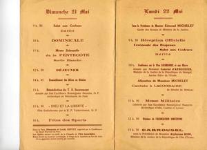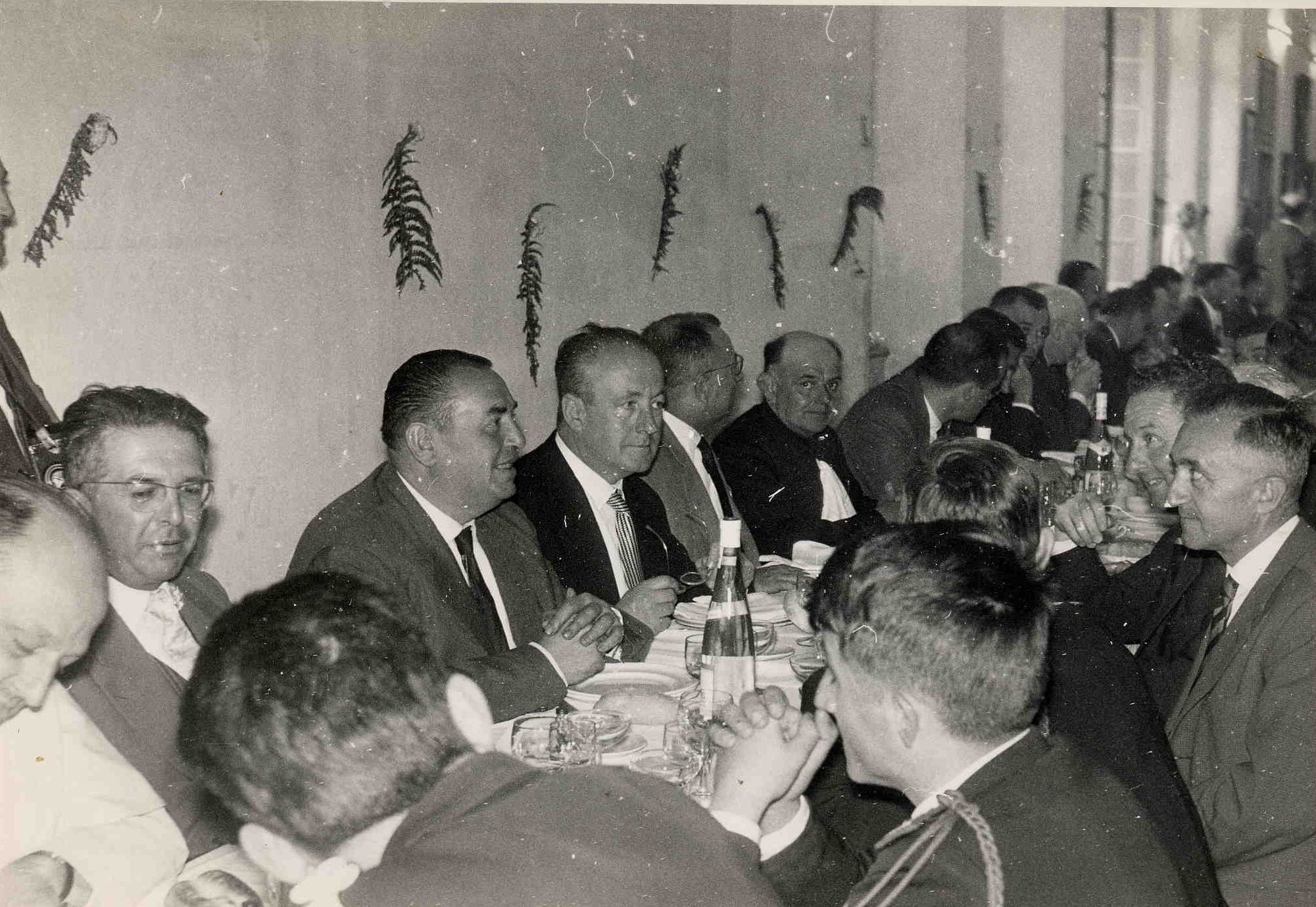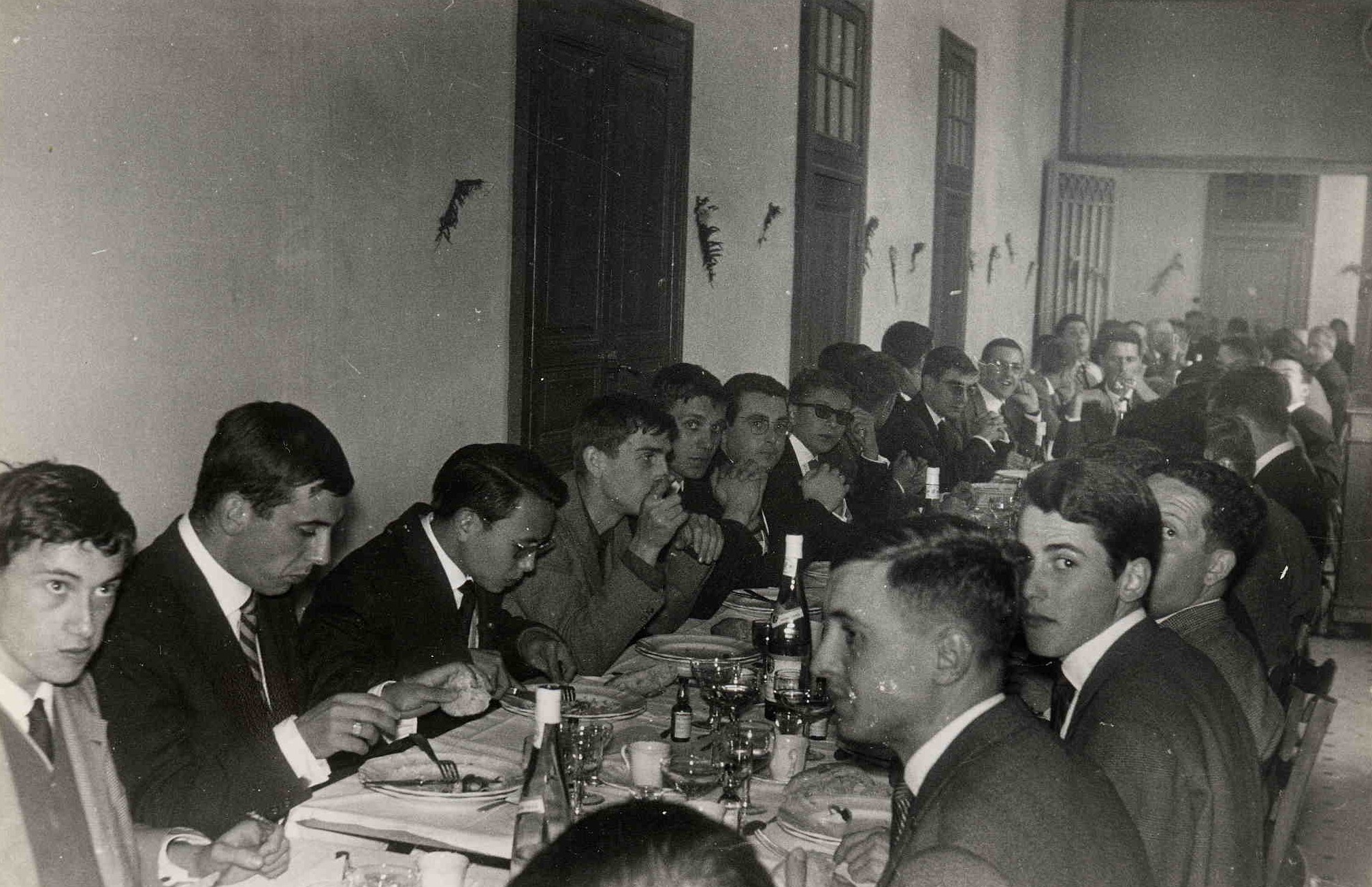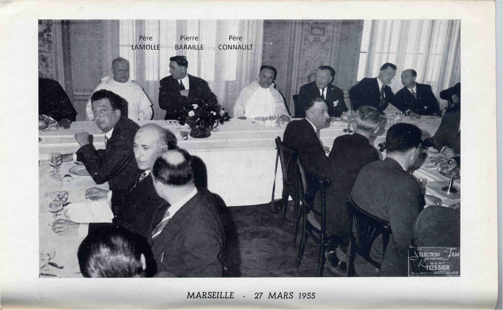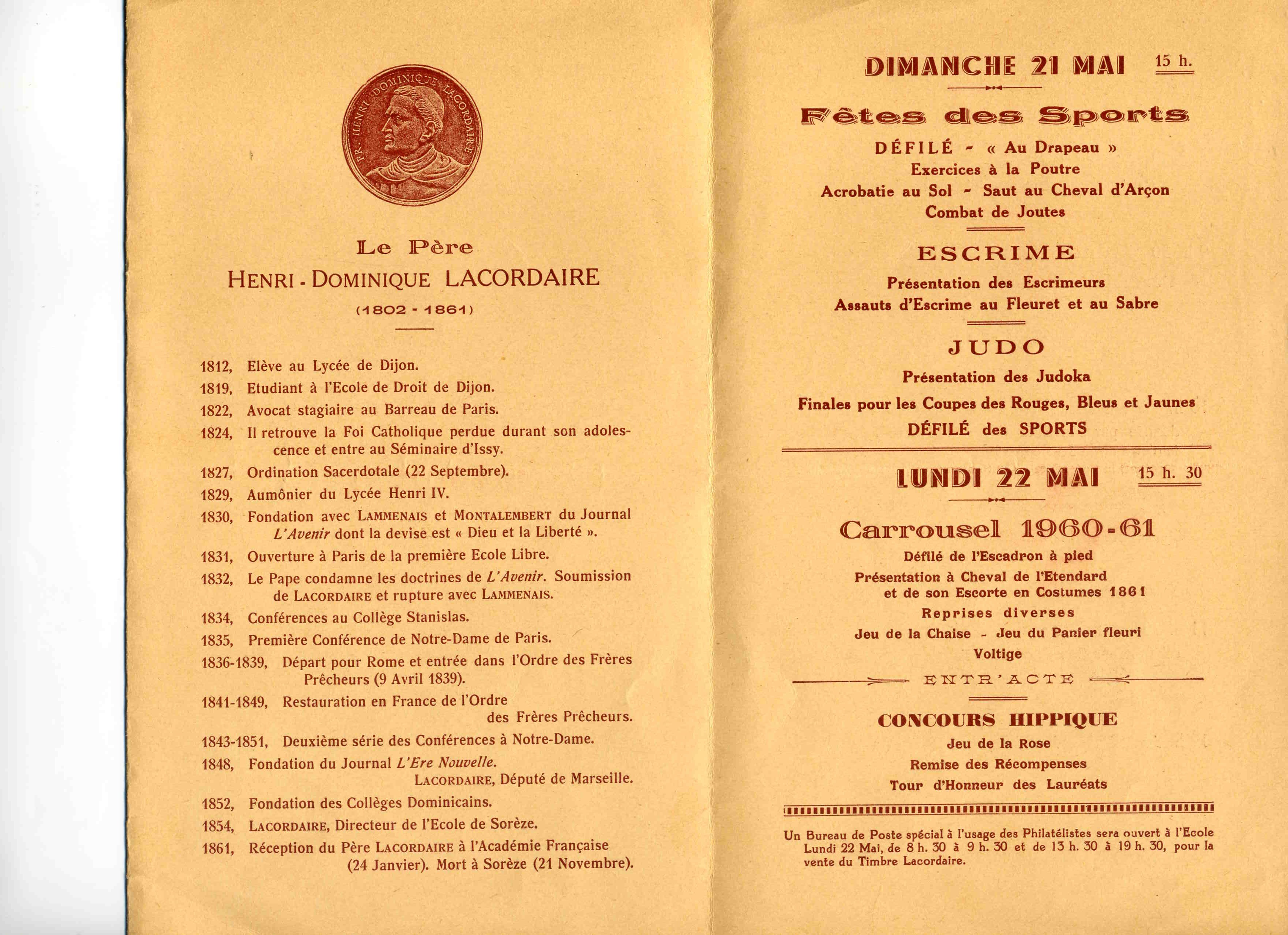 | ![]() Sainte Cécile 1960 | le drapeau (il faisait un très très véhément vent d'autan) 1er rang : Jacques Rougé, Gaston Bergasse, Xavier Flamand 2ème rang : Riba à droite ? ![]() Notre Etat Major a géré les festivités du « Centenaire de la mort du Père Lacordaire », dont j'ai retrouvé la description de la fête de la St Cécile, le 21 novembre 1960. Certaines des photos s'expliquent : | -L'état Major a été nommé auparavant, peut être la veille. Mon père me remet le drapeau le 20 novembre .. -L'attente dans la cour d'honneur est pour la réception de toutes les personnalités décrites dans le fascicule ci-joint, en page 1 et 2 -Le lever aux couleurs entre Louis XVI et l'obélisque -Un discours dans la salle des bustes « Pourquoi Lacordaire est-il venu à Sorèze » -La messe -Un repas (lecture d'une lettre de Son Excellence H.OUEDRAOCO, Ministre de Haute-Volta et Maire de Ouagadougou ! Avez-vous la réponse pourquoi lui ?), plusieurs orateurs anciens élèves, puis le préfet pour clôturer la journée ! ![]() Pentecôte 1961 | Le programme ![]() Pentecôte 1961 | ![]() Pentecôte 1961 | ![]() Pentecôte 1961 | Le menu du banquet ![]() Repas des anciens à la Sainte Cécile 1960, dans le réfectoire des pères : | Louis Bergasse avec ses lunettes, à côté du père Dastarac, René Pagès, l'oncle de Bruno et d'Henri, et Jacques Robin, en face, Gaston, Yves Bergasse, son père, 3eme sur sa droite, frisé, Et Gaston, bien sûr, de profil au premier plan ![]() Pentecôte 1961 | Repas des anciens, Henri Pagès, Bernard Delaude (avec des lunettes noires), Pierre-Jean Seignez. ![]() X, Laurent, Michel Galibert, puis Roy et Bergasse