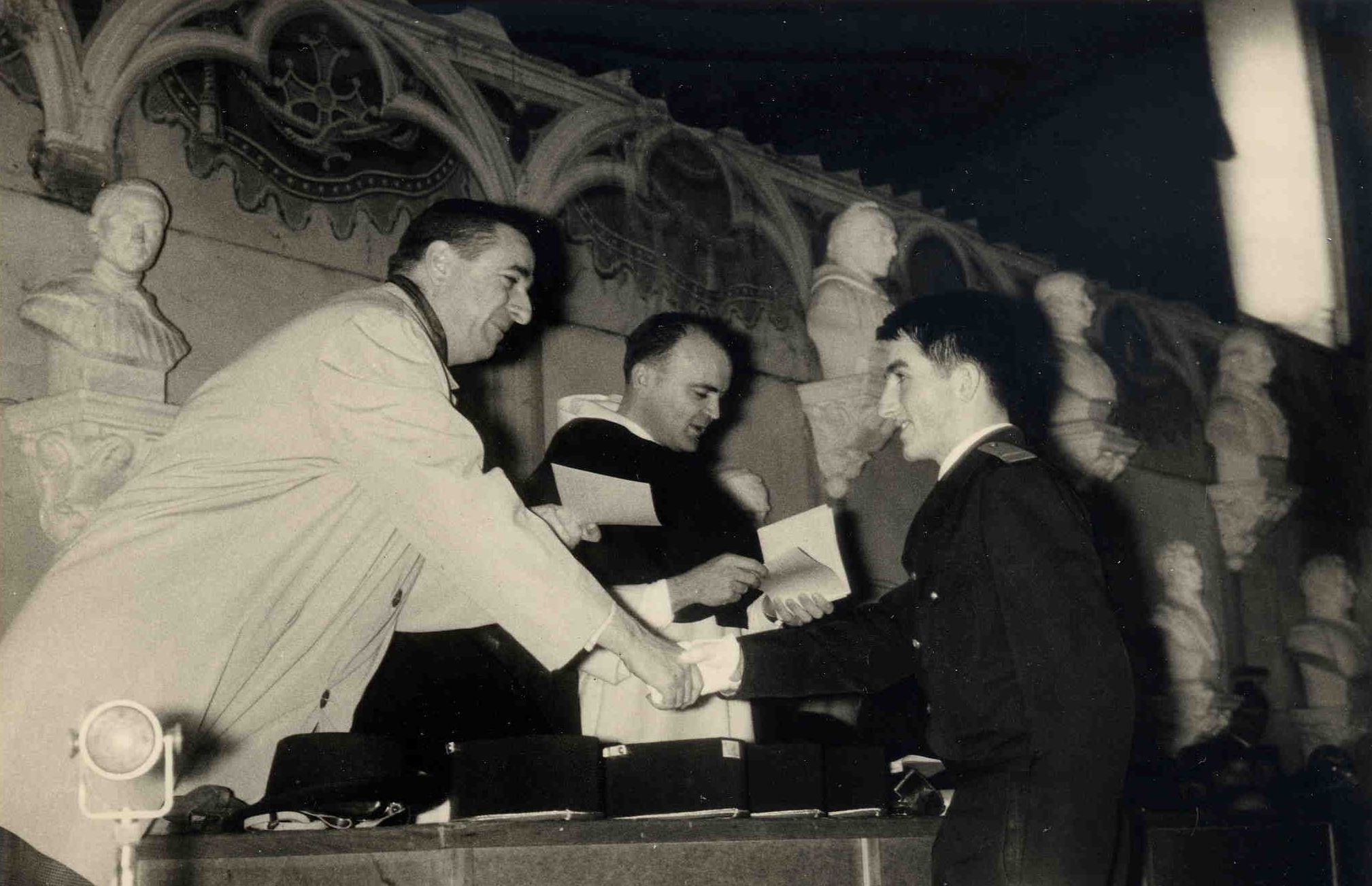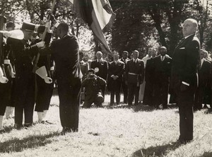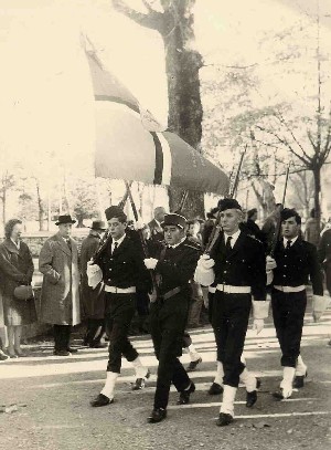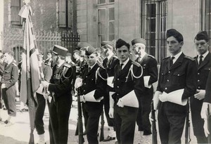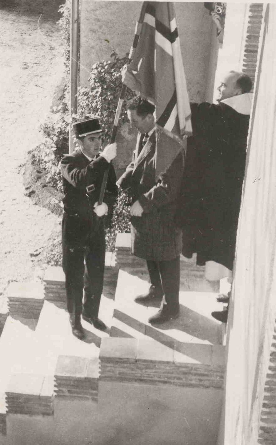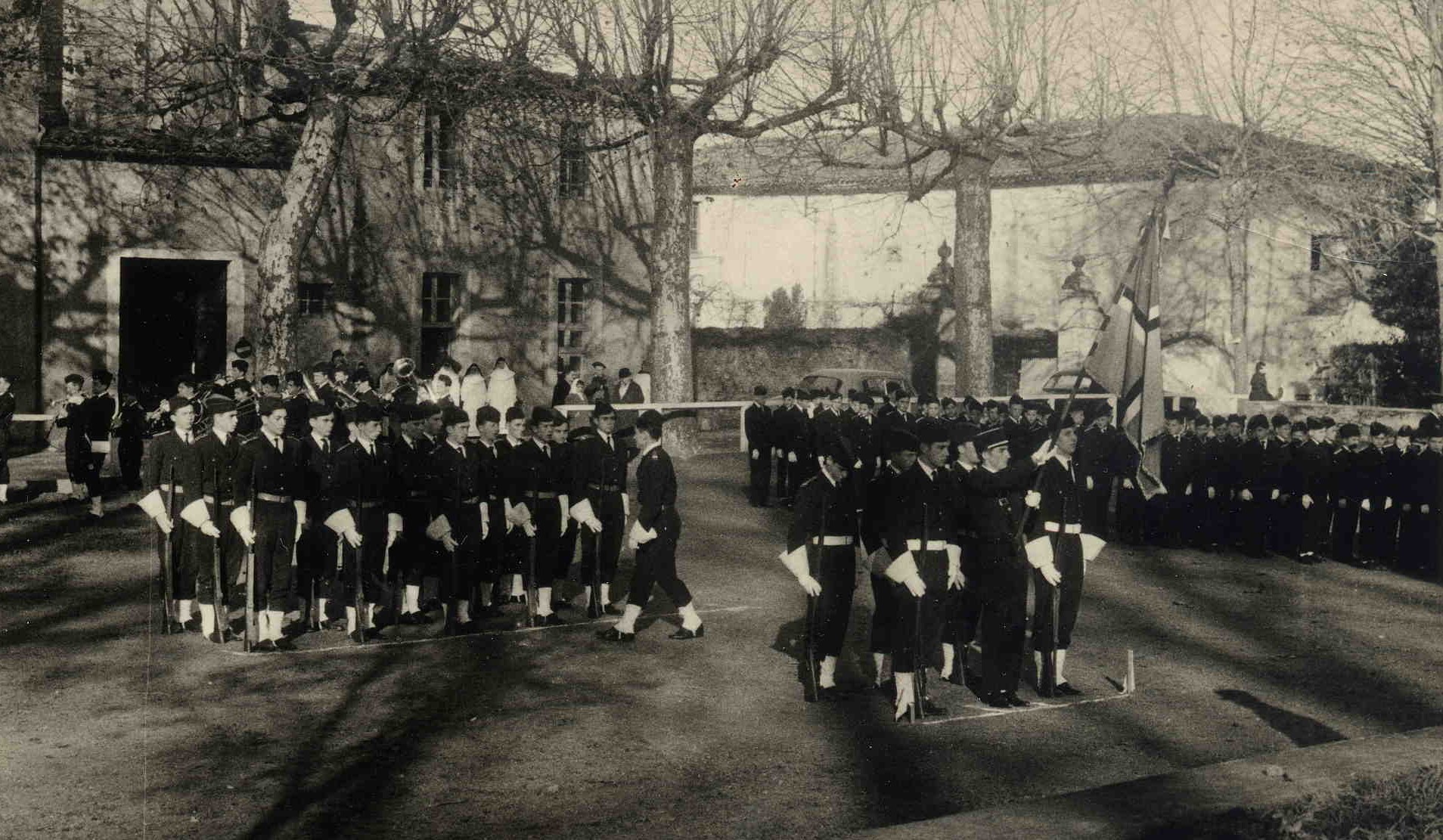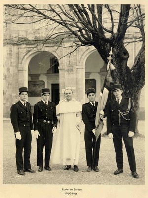 | ![]() Sainte Cécile 1960, | Dominique Mugnier, sergent d'honneur, Jean Laurent, sergent-major, le père Montserret, Gaston Bergasse, porte-drapeau, Louis Roy, maître des cérémonies ![]() Bergasse, Philippe Languillon, Michel Galibert, et François Ménard | au fond à gauche du drapeau Didier Campardou et, derrière Bergasse, Jacques Rougé, Jean-Louis Martinel, Xavier Flamand, Jean-Louis Desvilles ![]() Sainte Cécile 1960 | Prise d'armes dans la carrière ![]() Gabriel D'Arboussier remet le drapeau à Bergasse, sous l'oeil de Jacques Robin, président de l'Association Sorézienne
