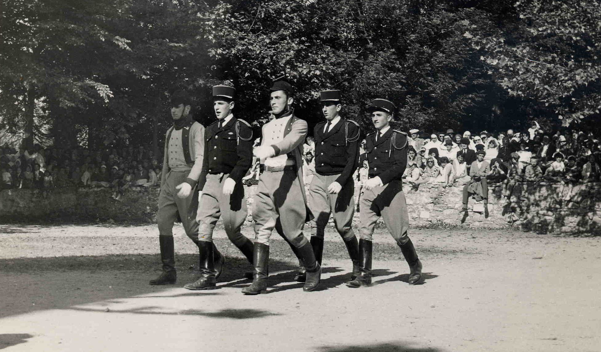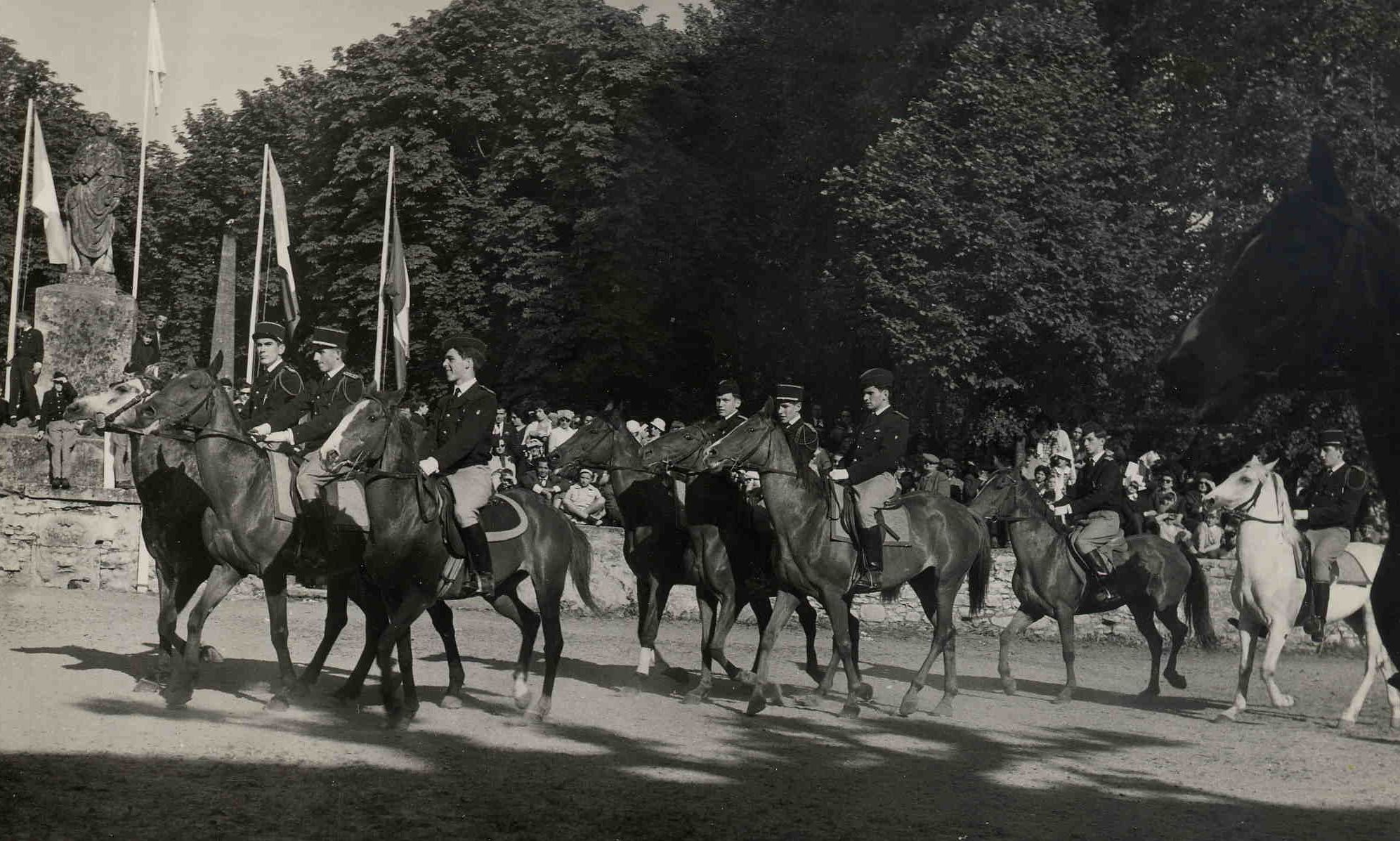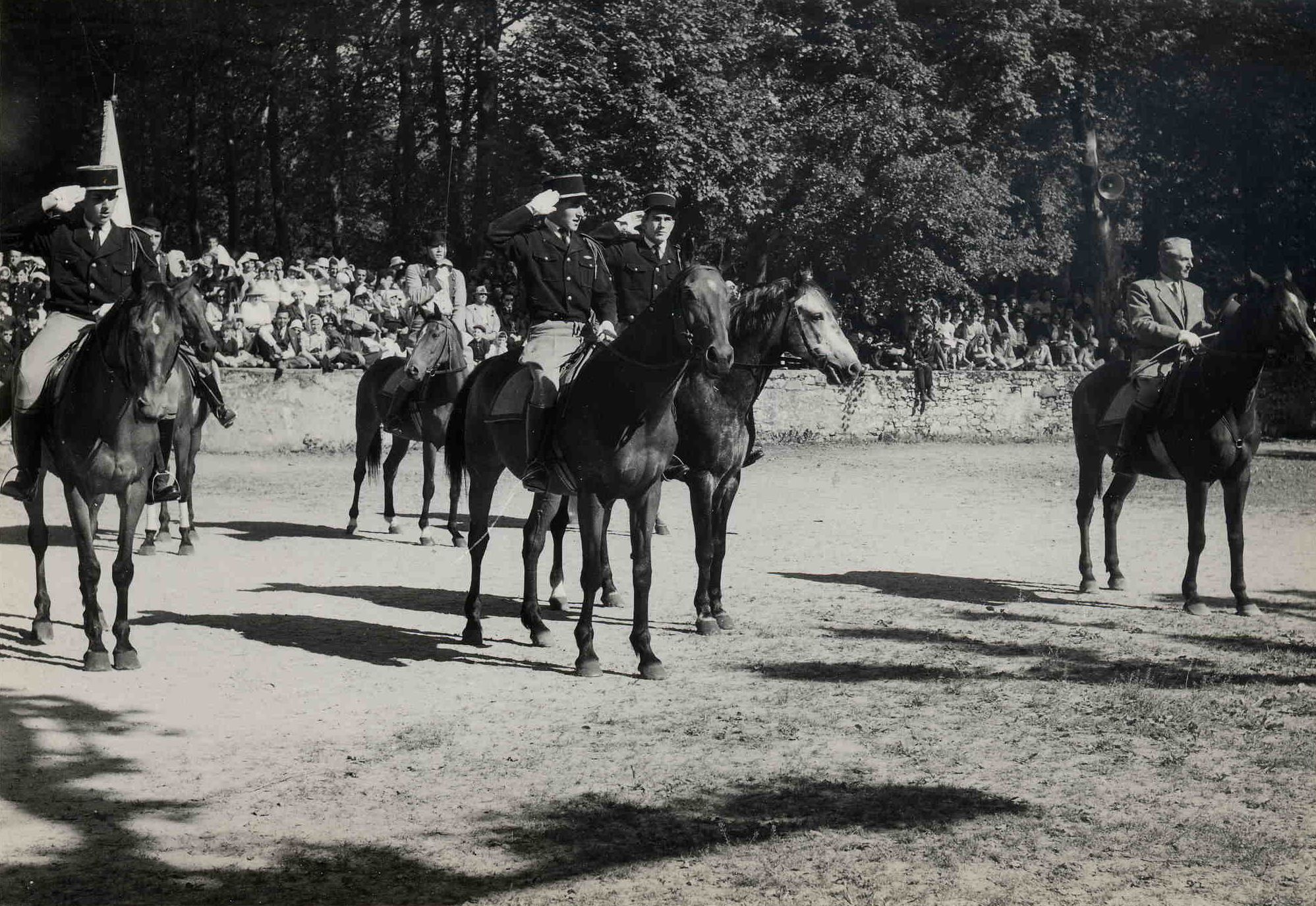 | ![]() Pentecôte 1961, | tous les membres de l'état-major sont des cavaliers. On reconnait Jean-François Bellon dans la 2ème rangée et Jacques Schneider sur la 3ème ![]() Louis Roy, Jean Laurent, Alain Meunier, Maître René Roques, et Gaston Bergasse derrière Roy