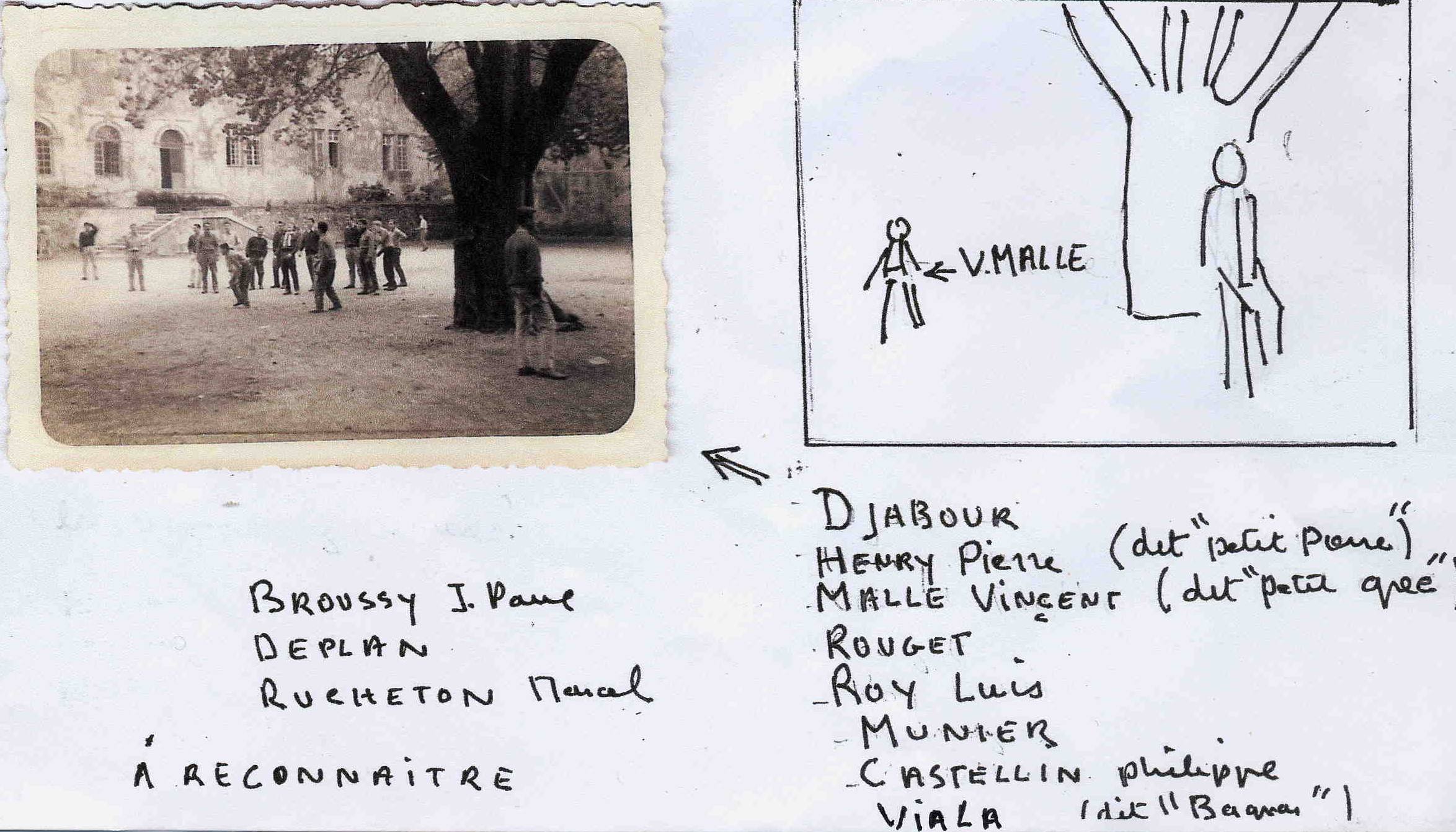 ![]() Mars 1960, fête des Rouges. Gaston acteur dans une pièce. Le texte de la pièce. On peut voir également sur la photo prise dans la cour des rouges, Dominique Mugnier déguisé en femme, Vincent Malle, le frère de Louis le cinéaste, et Jean-Pierre Calzaroni.